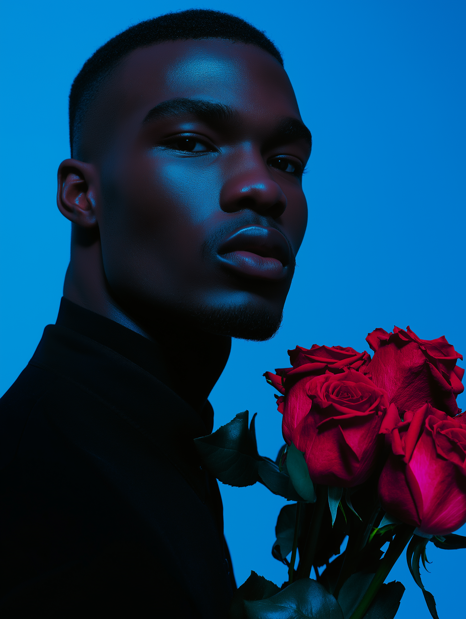 Portrait of a young Black man holding red roses against a blue background, with dramatic lighting highlighting his features.