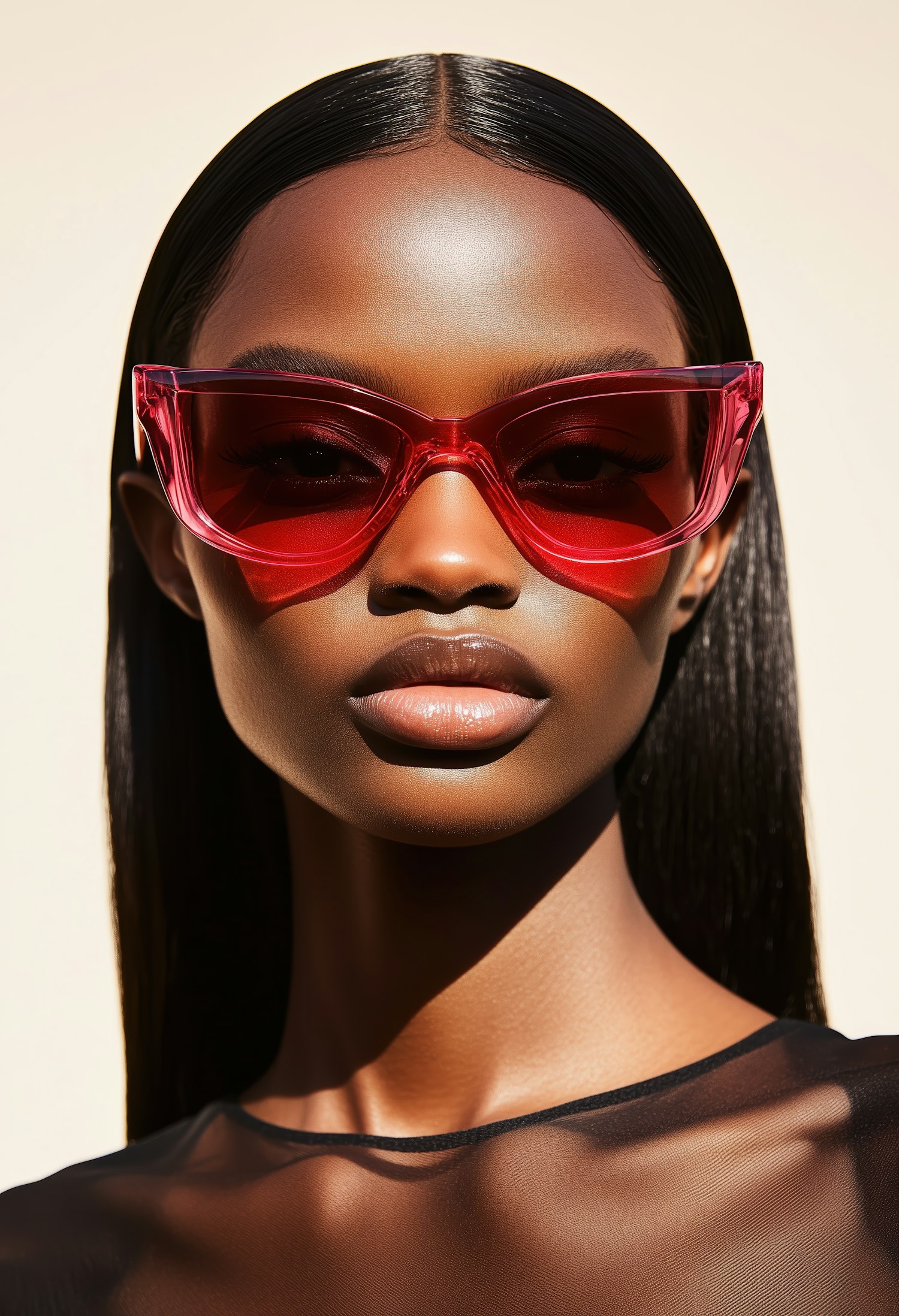 Stylish Black woman with sleek hair and bold red sunglasses, exuding confidence and elegance against a neutral background.