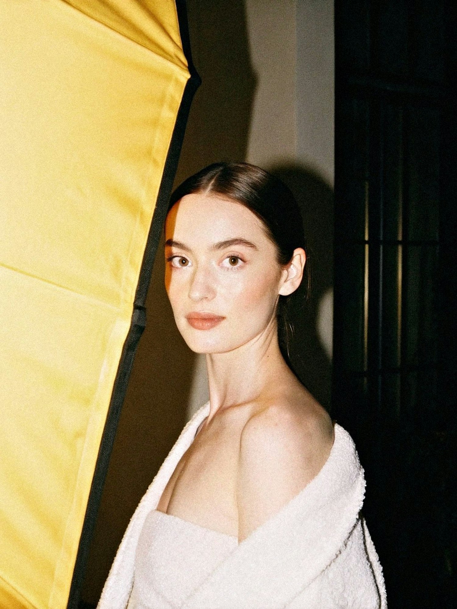 A woman with sleek hair and a white towel poses near a yellow reflector, creating a warm and composed portrait.