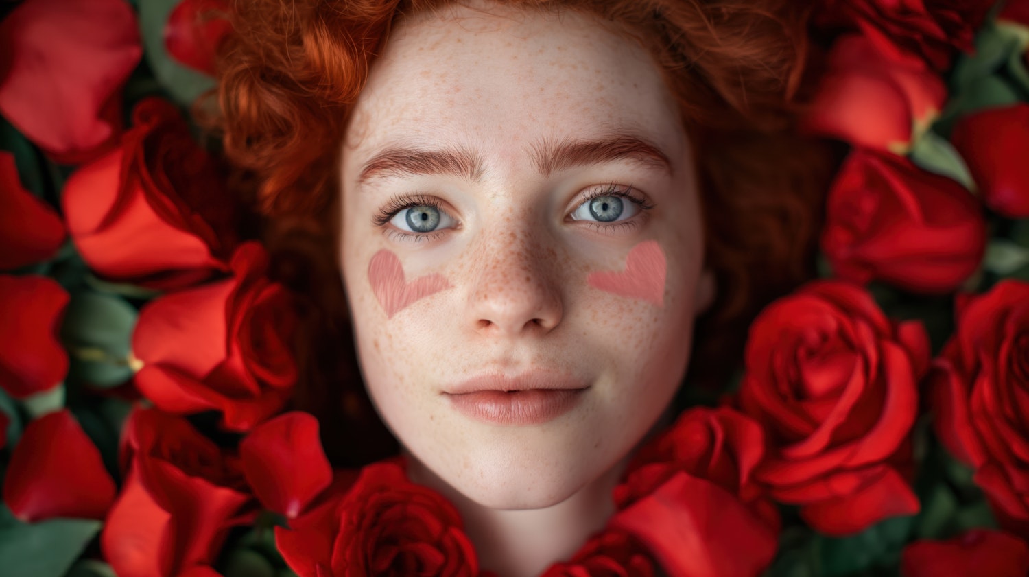 A serene woman with red hair and blue eyes surrounded by vibrant red roses, featuring pink heart shapes on her cheeks.