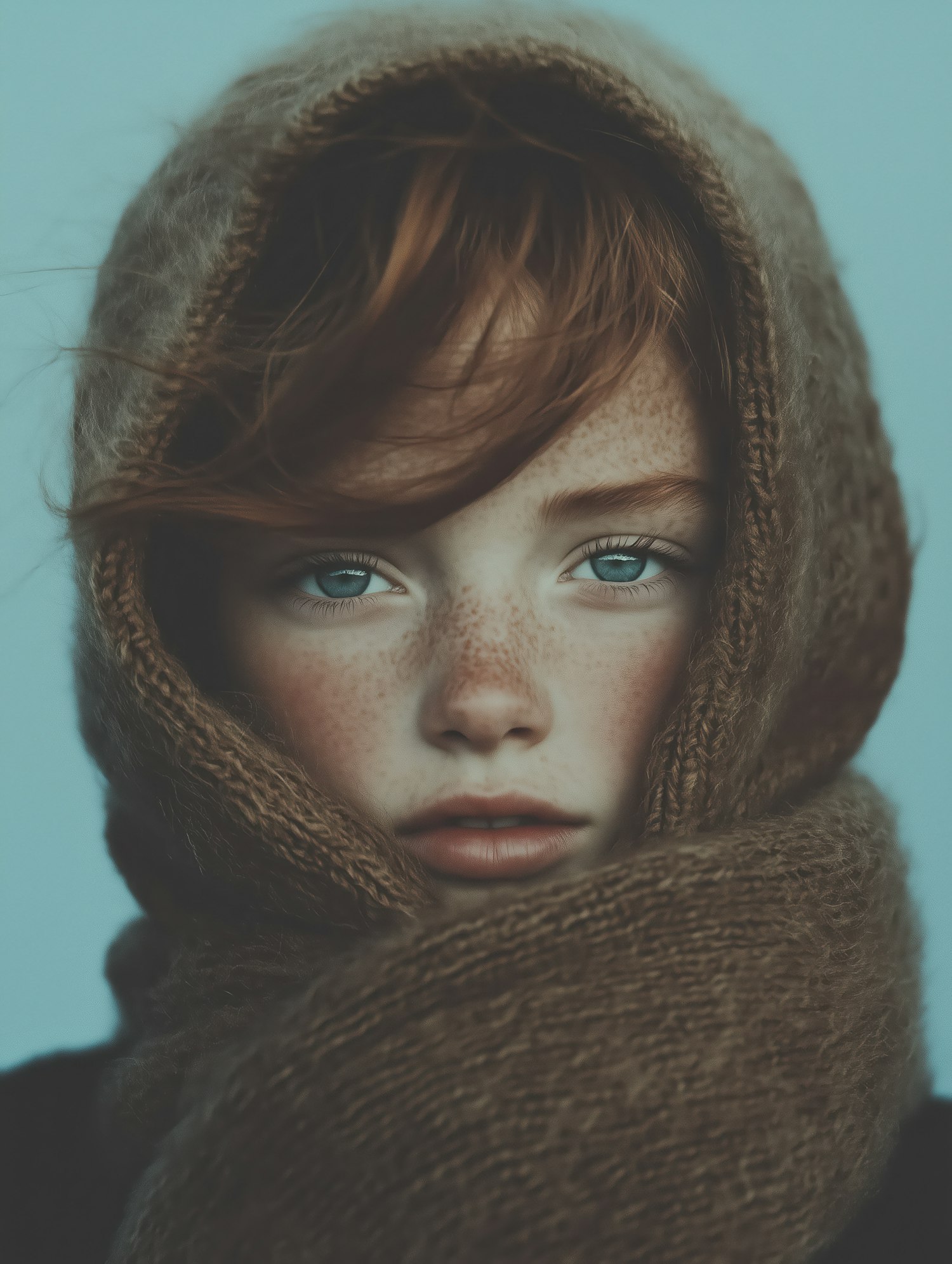 Close-up of a freckled face wrapped in a brown scarf, with piercing blue eyes and red hair against a muted blue background.