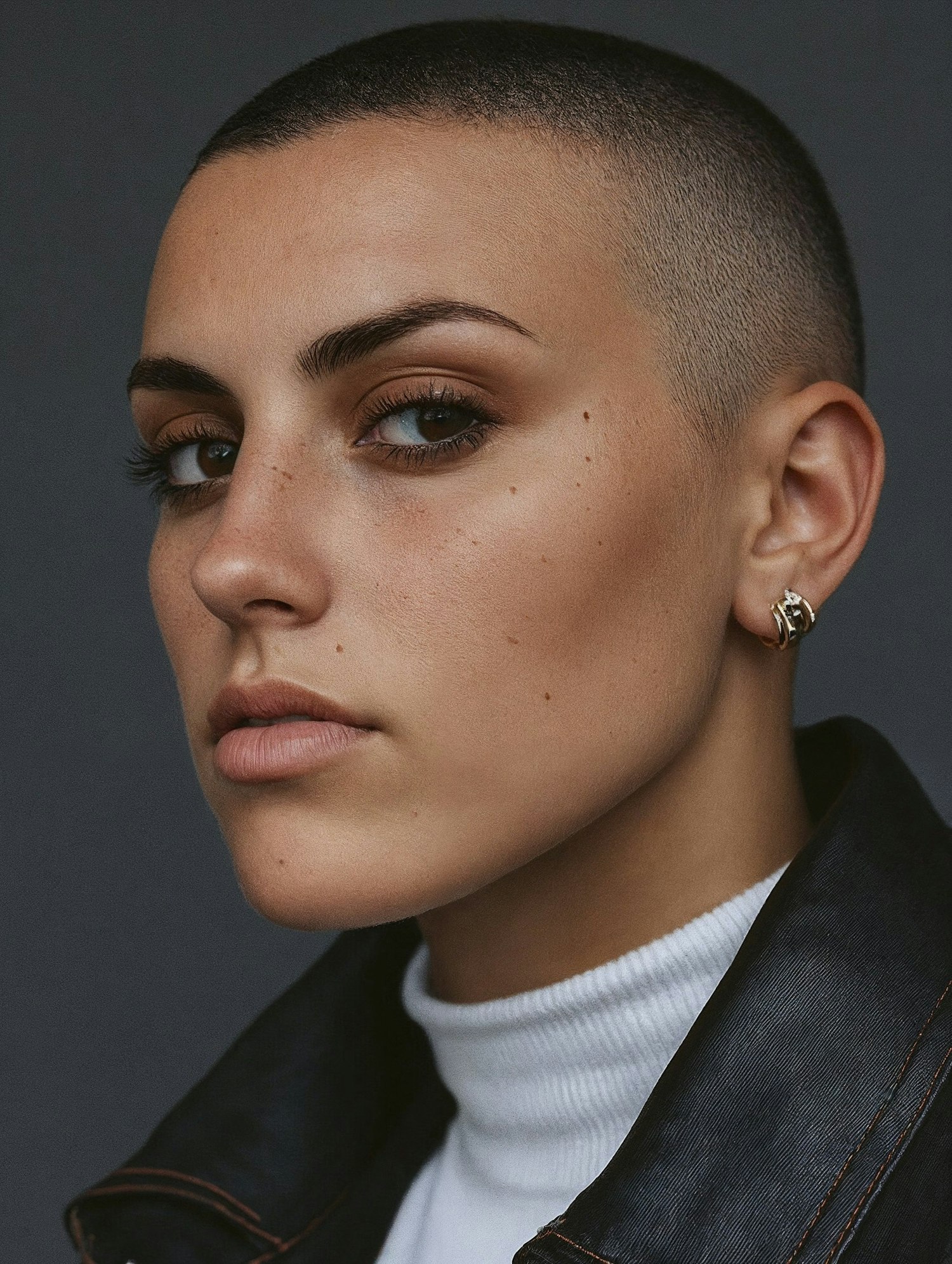 Close-up of a person with a shaved head, bold features, and a leather jacket, exuding confidence and style in soft lighting.