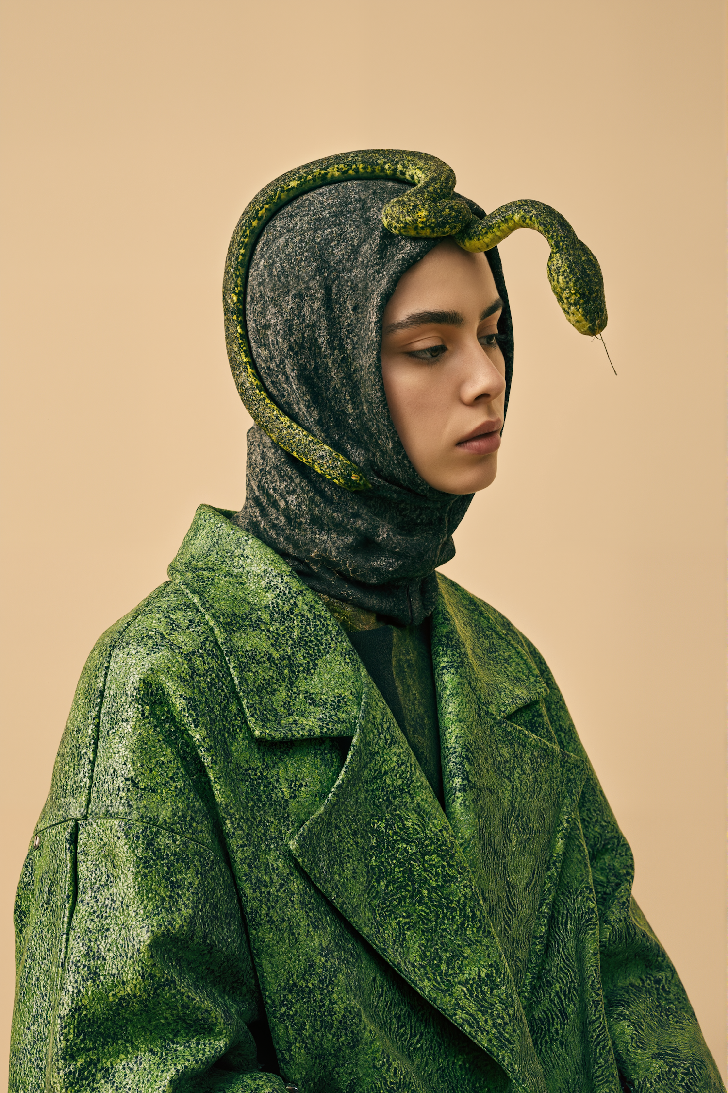 A surreal portrait of a person in a green textured coat with a snake-like headpiece, set against a muted beige background.