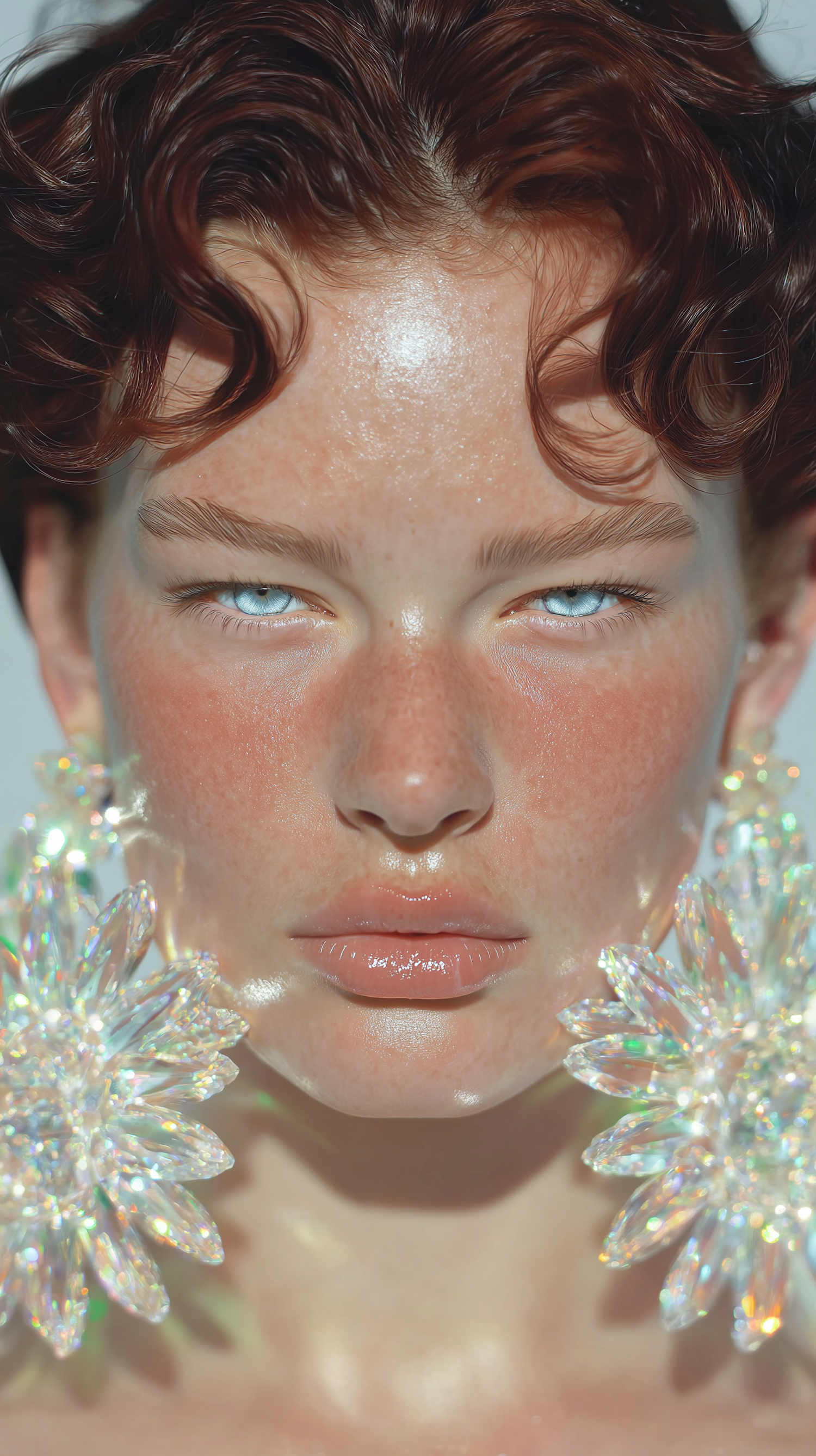 Close-up of a person with light blue eyes, auburn hair, and sparkling crystal earrings, showcasing a luminous and detailed portrait.