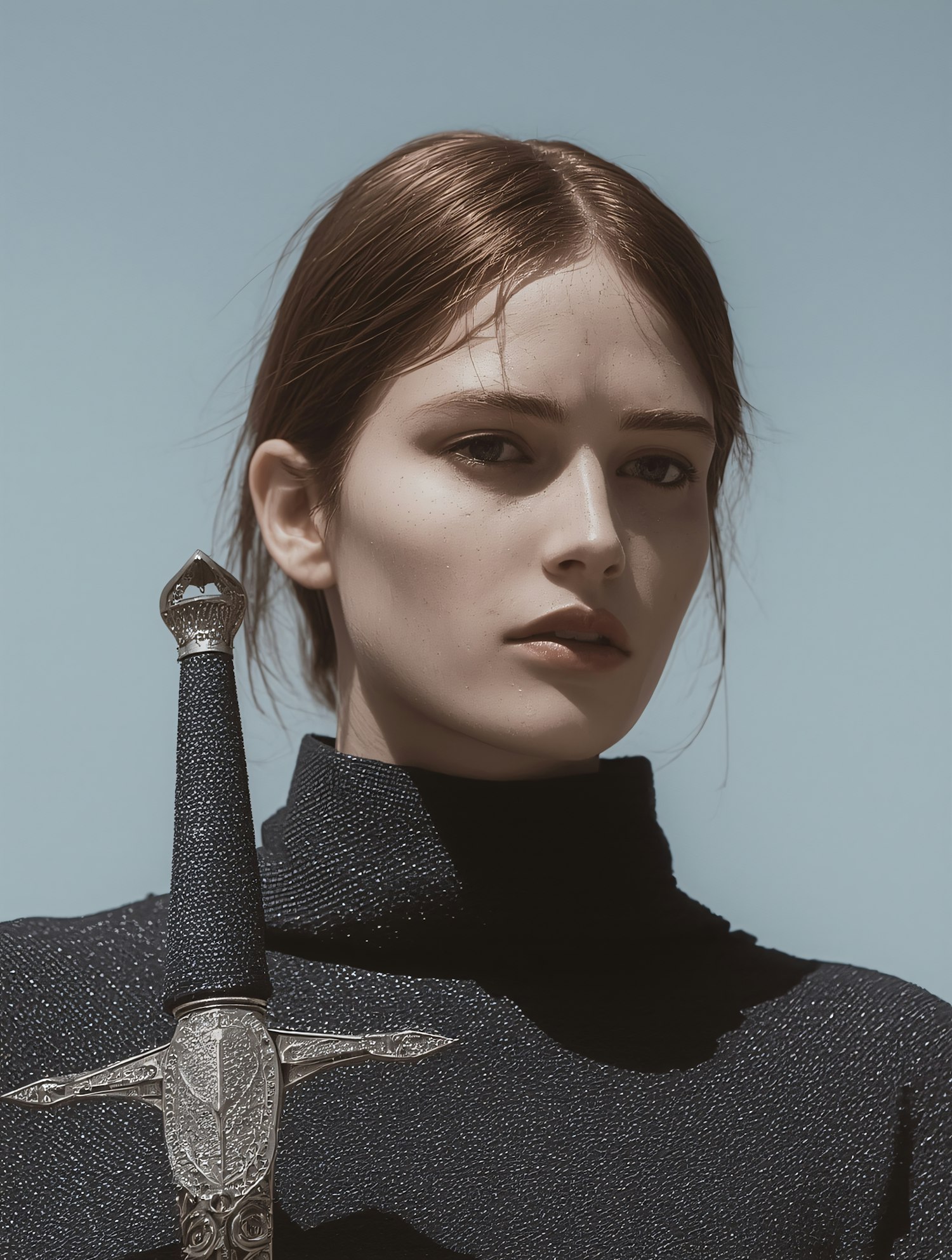 Close-up of a woman holding an ornate sword, wearing a textured dark outfit, set against a clear blue sky.