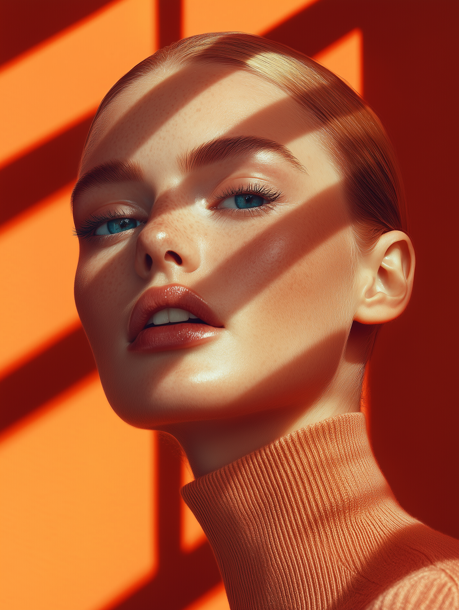 Striking portrait of a woman with blue eyes and blonde hair against a vibrant orange background, featuring dramatic shadows.