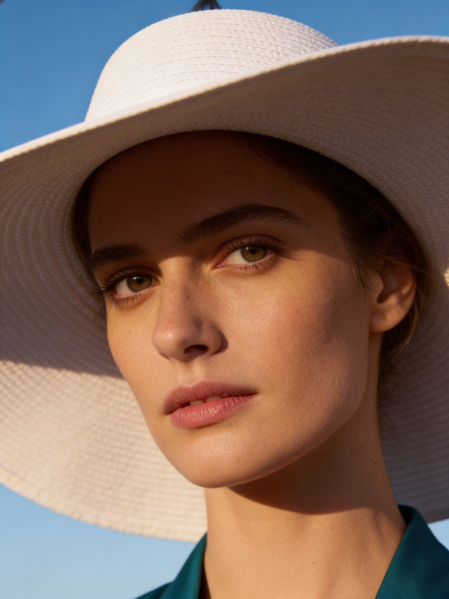Close-up of a person in a white hat under warm sunlight, with a clear blue sky background, showcasing serene and natural beauty.