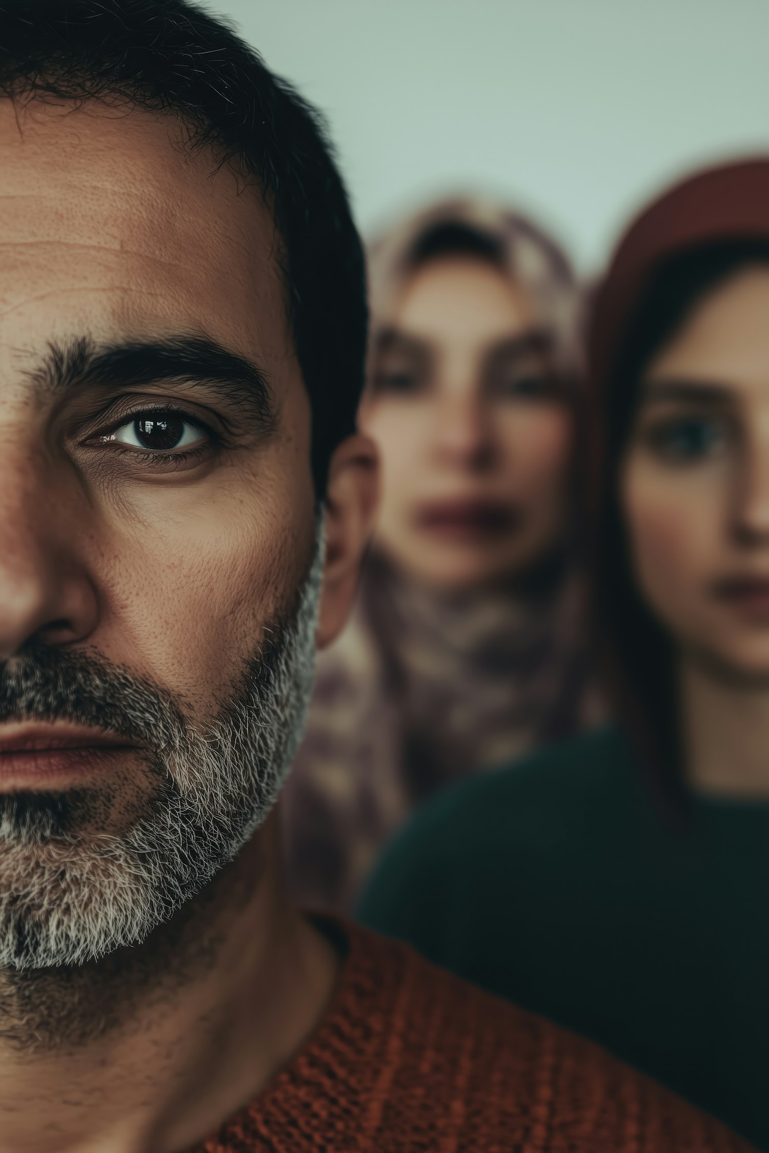 Close-up of a man with a salt-and-pepper beard in focus, with two blurred women in the background, one in a hijab and the other in a headscarf.
