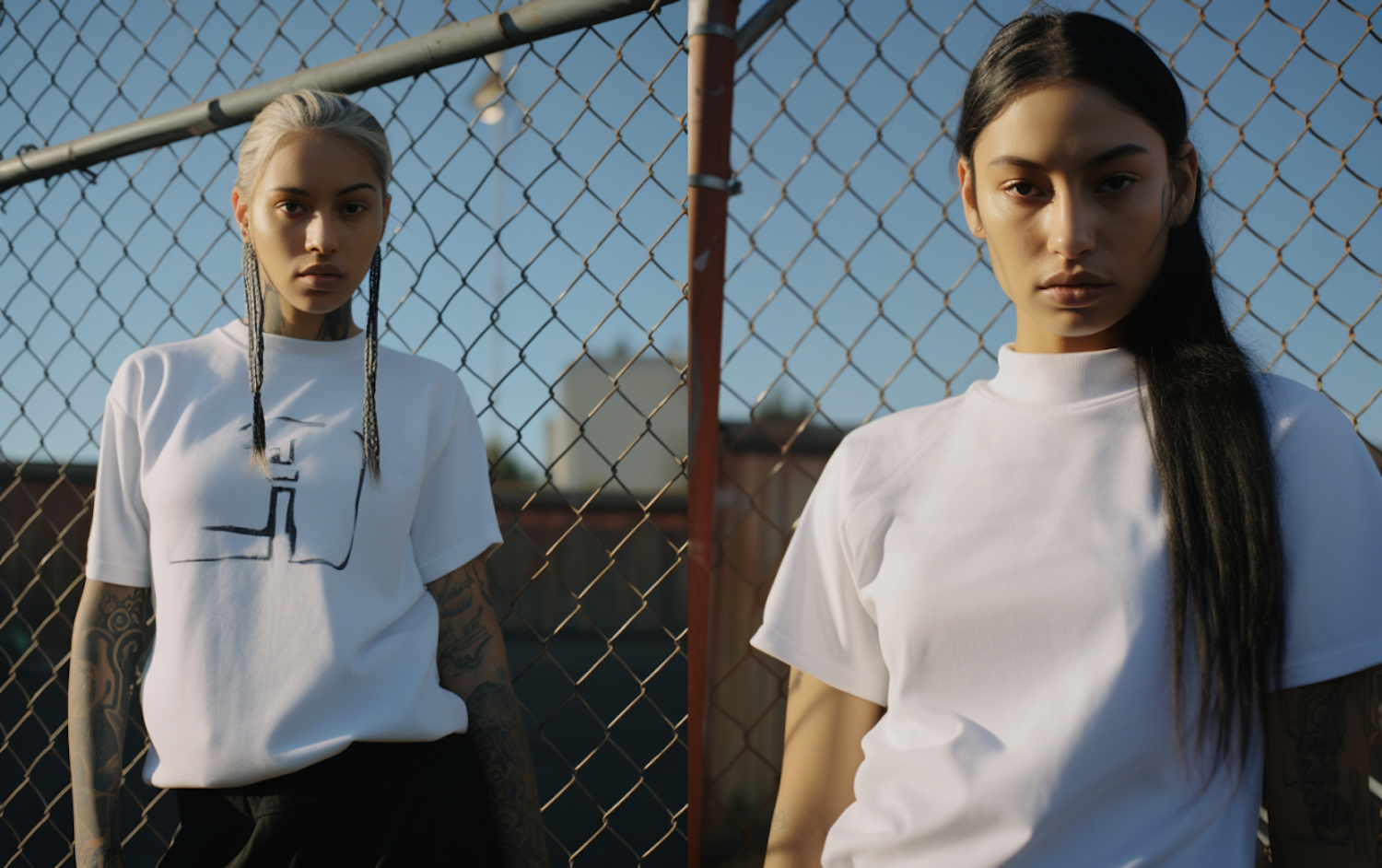 Two women in white t-shirts stand against a chain-link fence, showcasing urban fashion with tattoos and braided hairstyles.