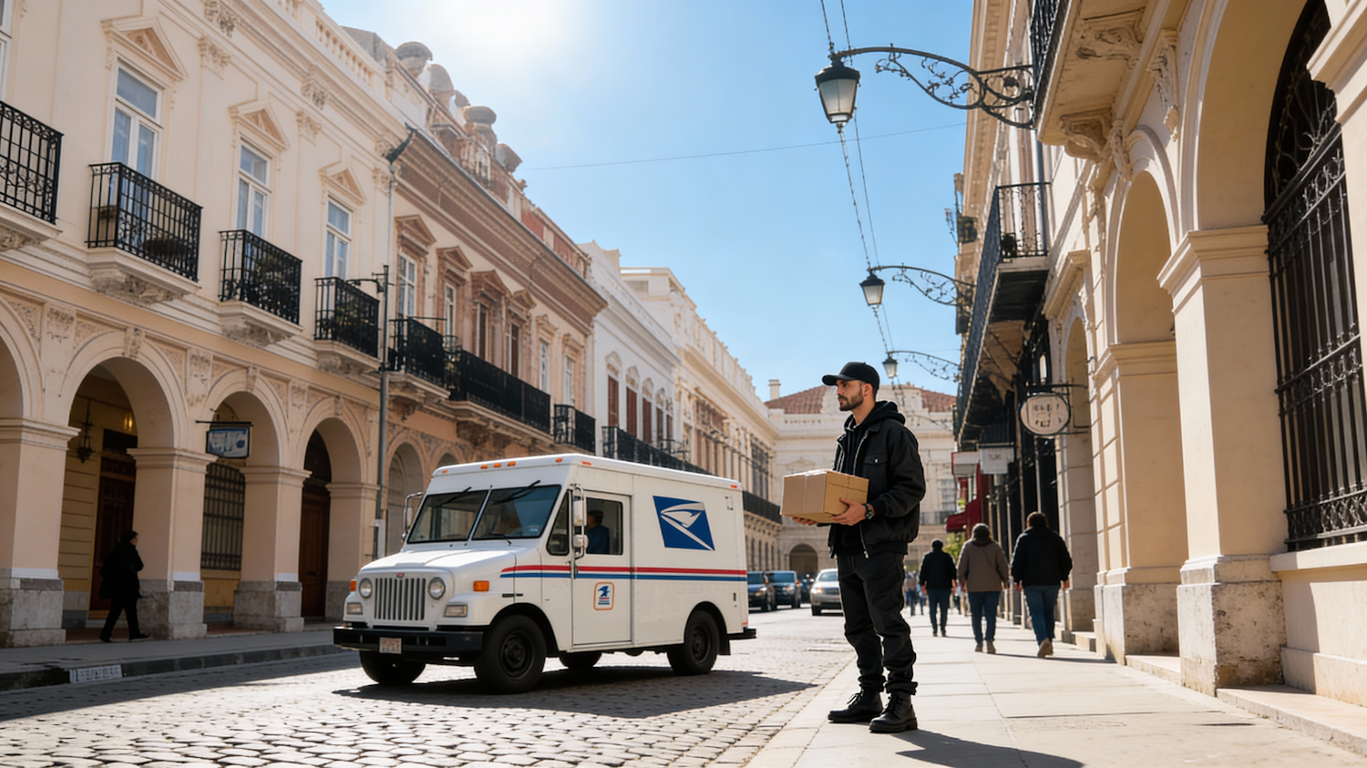 A postal worker holding a package stands near a delivery truck on a sunny day in a historic city street with ornate architecture.