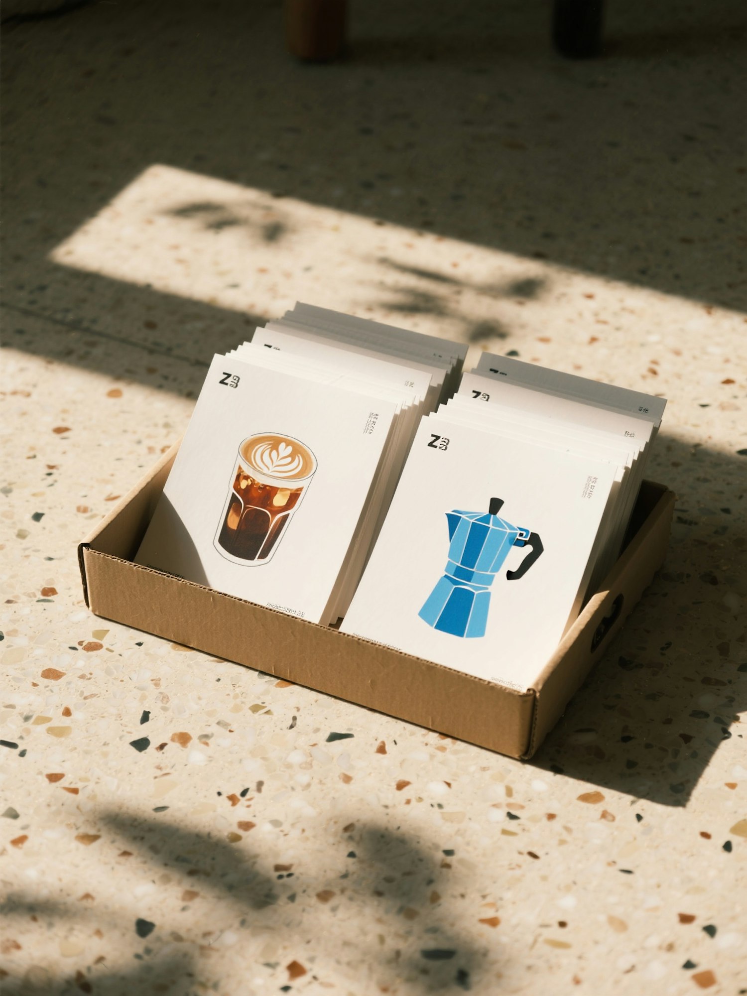 Flat lay of neatly arranged coffee posters inside a vintage tray or cardboard box, prints feature illustrations of iced coffee, latte art, and moka pots in modern editorial layouts, minimalist design, no branding, electric blue details, styled like a zine drop, shadow play on a beige terrazzo floor, warm light, Fujifilm aesthetic.