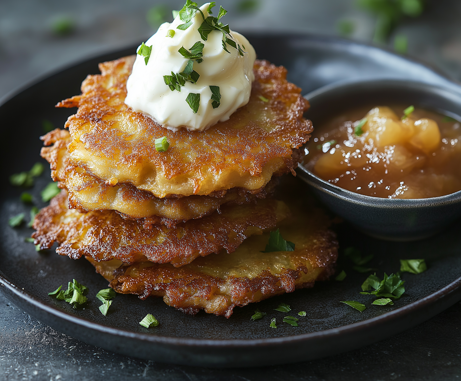 Golden potato pancakes with sour cream and applesauce on a dark plate, garnished with fresh herbs.