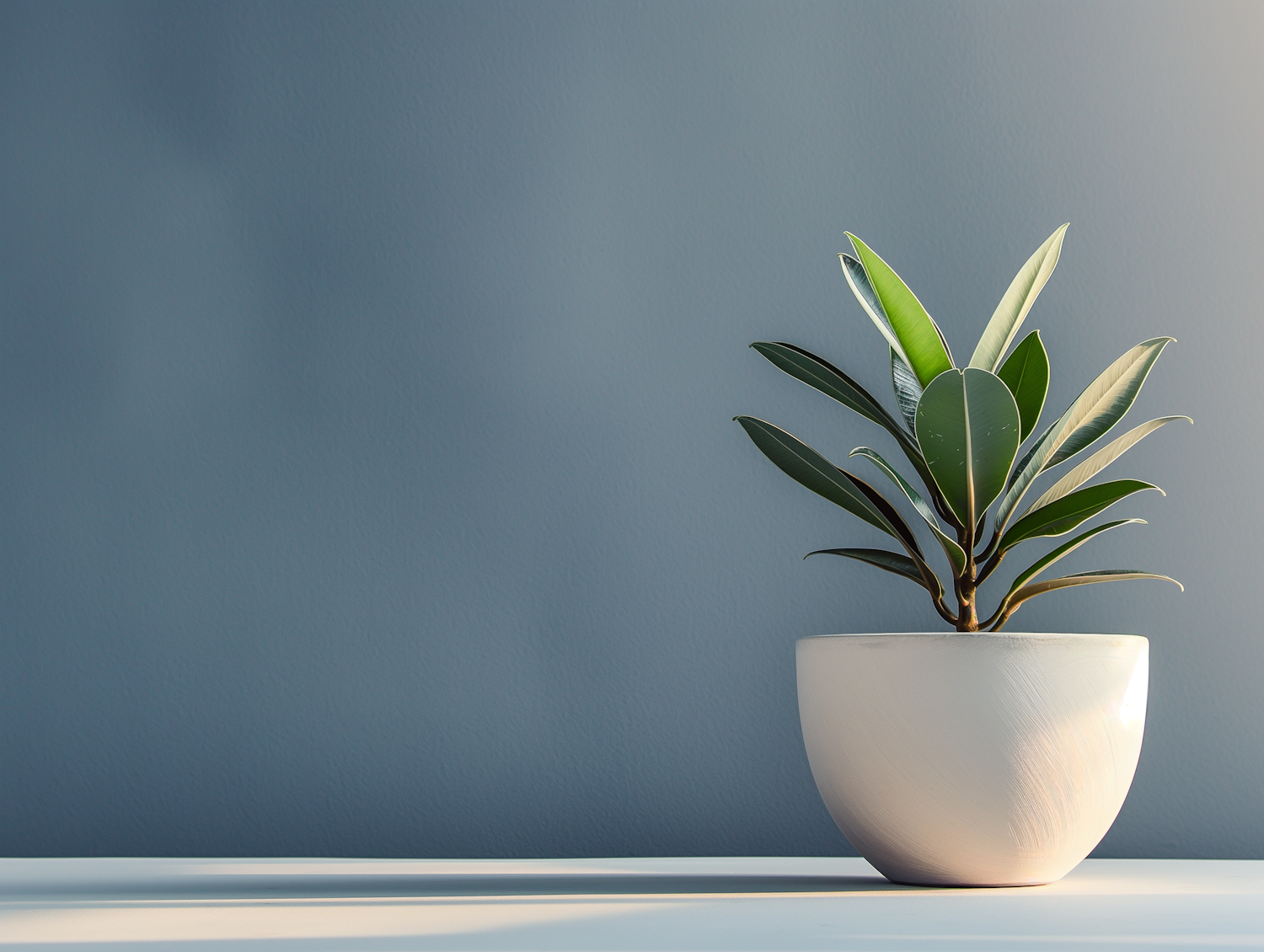 Minimalist potted plant with glossy green leaves against a muted blue background, creating a serene and calming atmosphere.
