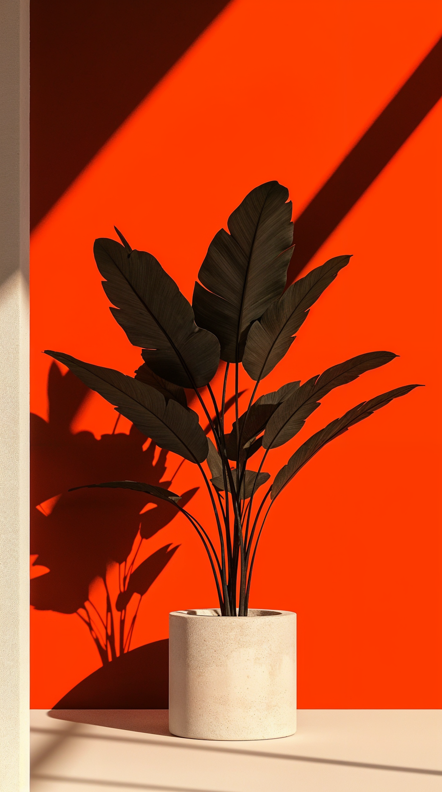 Bold potted plant with dark leaves against a bright orange wall, casting dramatic shadows in sunlight.