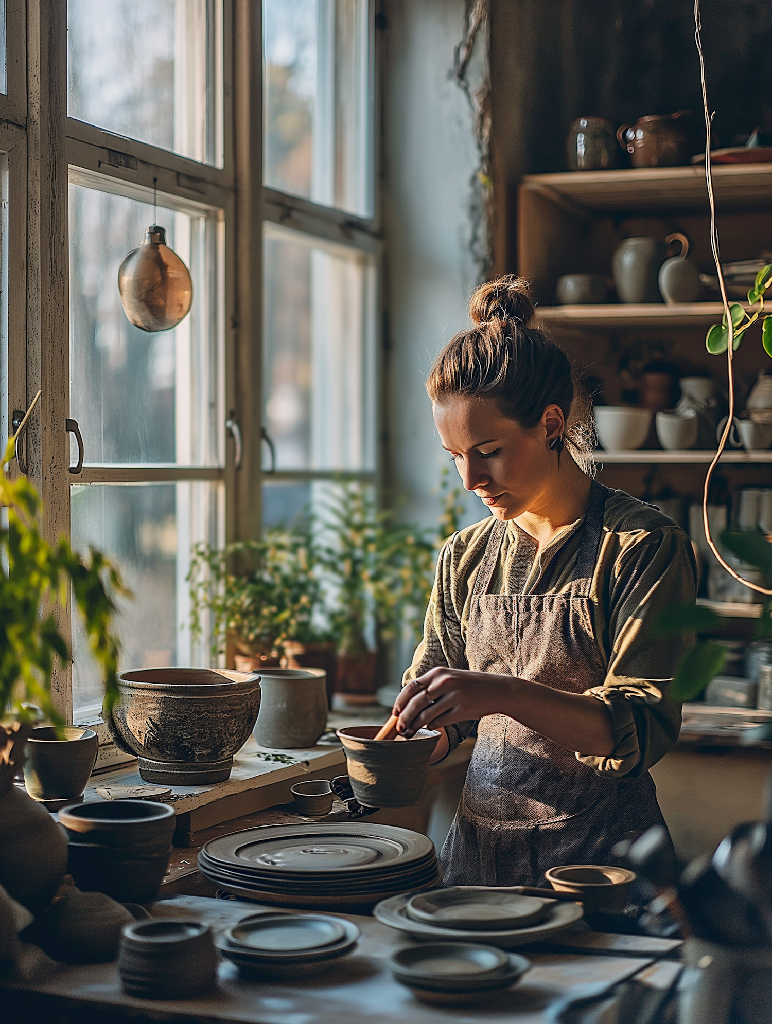 A woman in a pottery studio crafting clay bowls, surrounded by natural light and greenery, focused on her art.