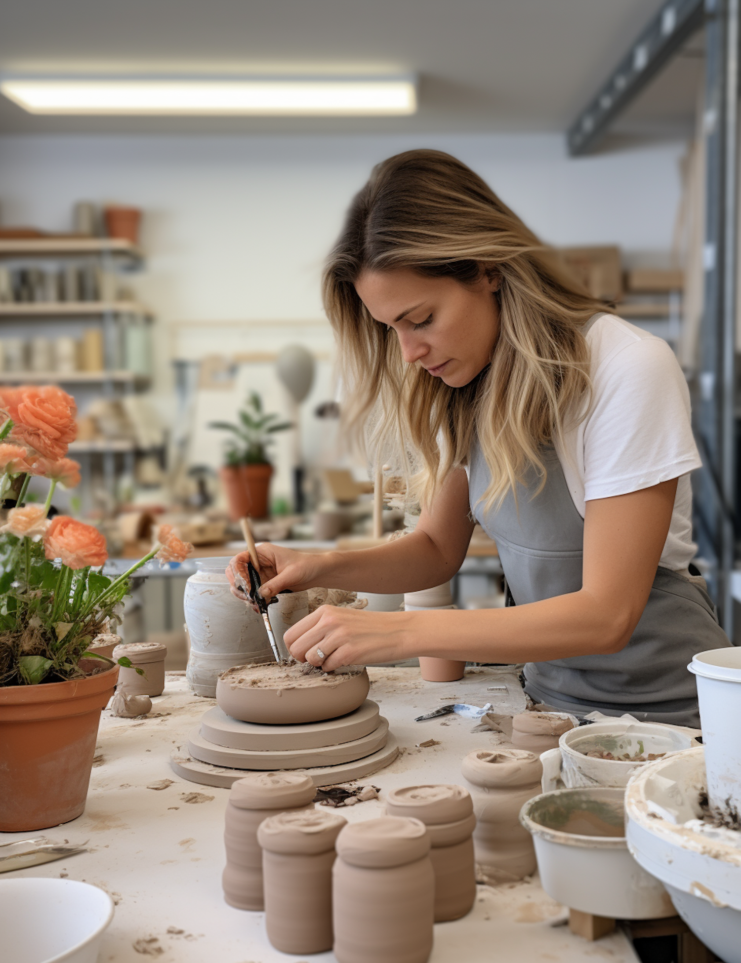 Caucasian woman crafting pottery in a bright studio, surrounded by clay and tools, wearing a gray apron and focused on her work.