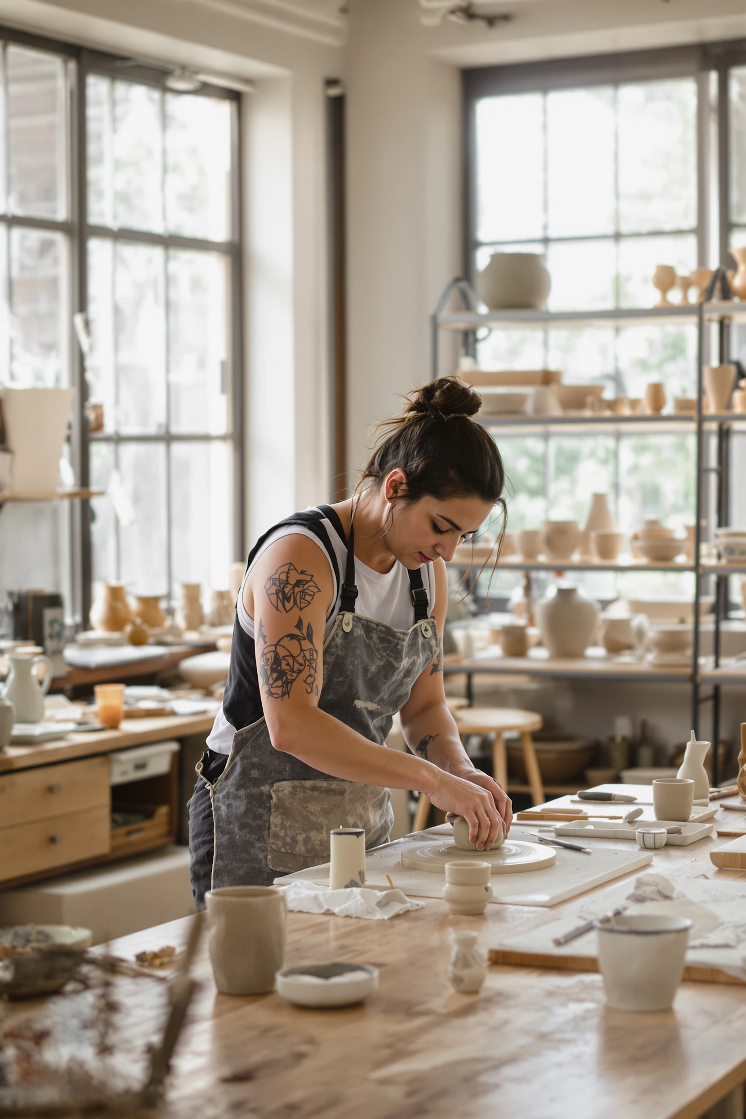 Woman crafting pottery in a sunlit studio, surrounded by tools and ceramic pieces, showcasing artistic focus and creativity.