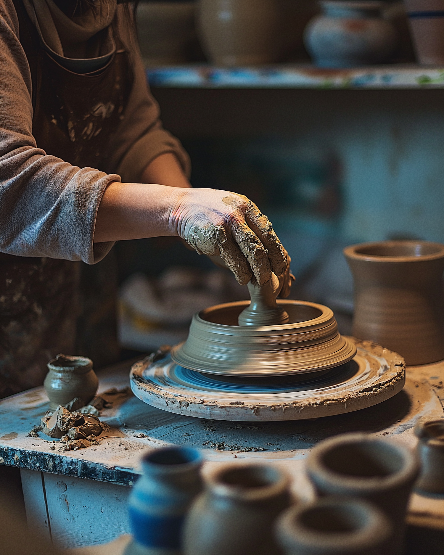 Hands shaping clay on a pottery wheel in a dimly lit workshop, surrounded by clay pots and tools, highlighting craftsmanship.