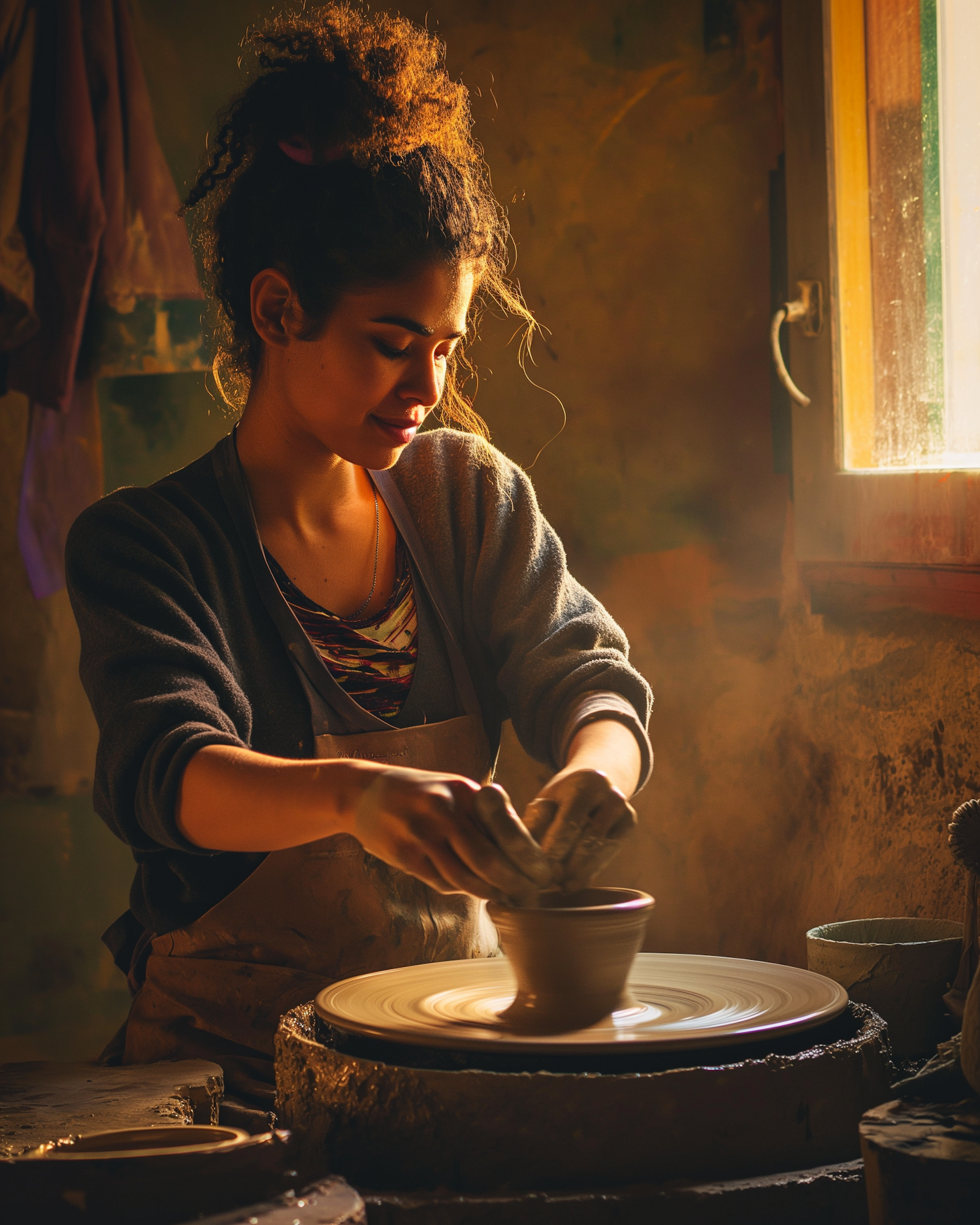 A serene young woman shapes clay on a pottery wheel in warm, golden light, surrounded by a rustic workshop setting.