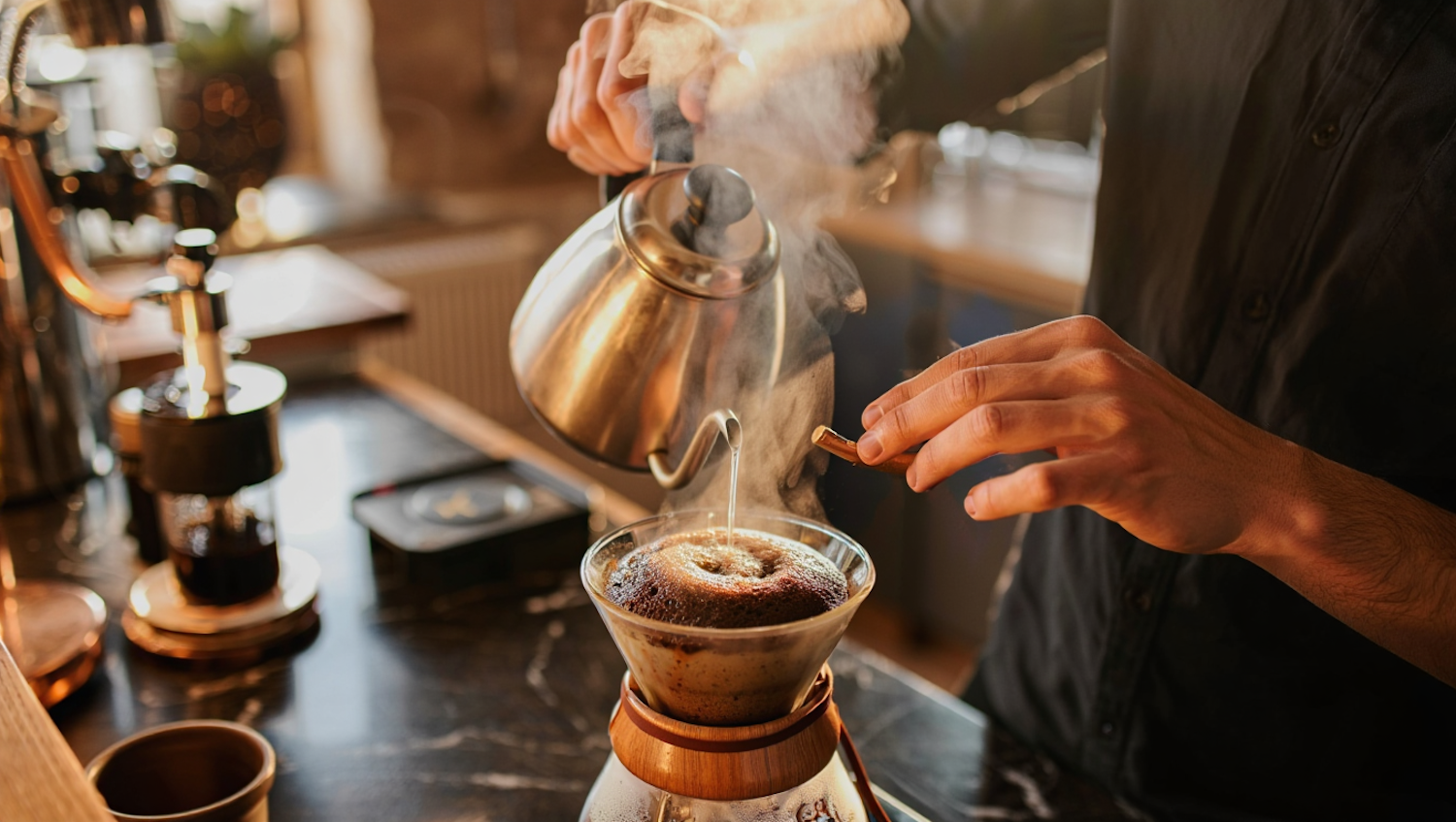 A person brewing coffee with a Chemex, pouring hot water from a gooseneck kettle. Steam rises, creating a warm, cozy atmosphere.