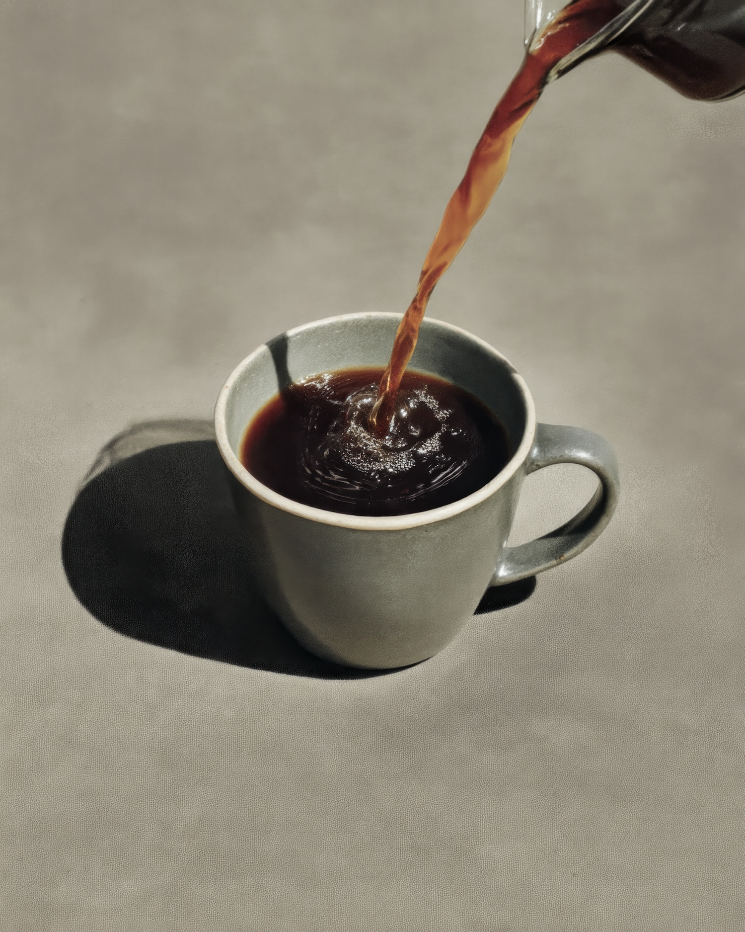 A close-up of coffee being poured into a gray ceramic mug on a neutral surface, with soft lighting and a minimalistic composition.