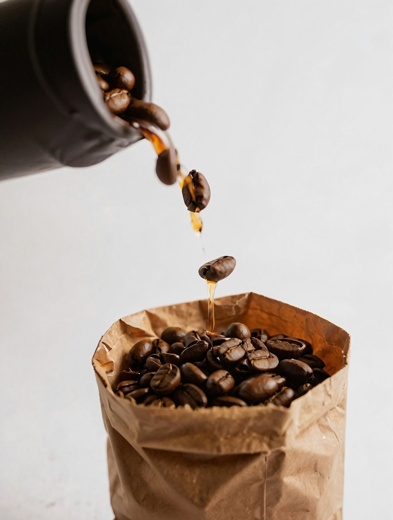 Rich roasted coffee beans being poured into a crinkled brown paper bag, with drops of coffee liquid adding a fresh touch.