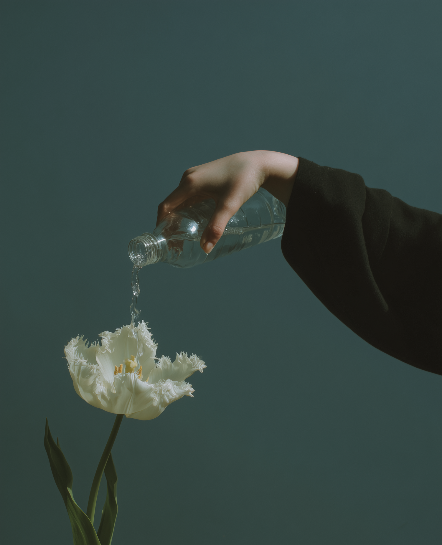 A hand pours water from a bottle onto a white fringed tulip against a muted teal background, creating a serene and minimalist scene.