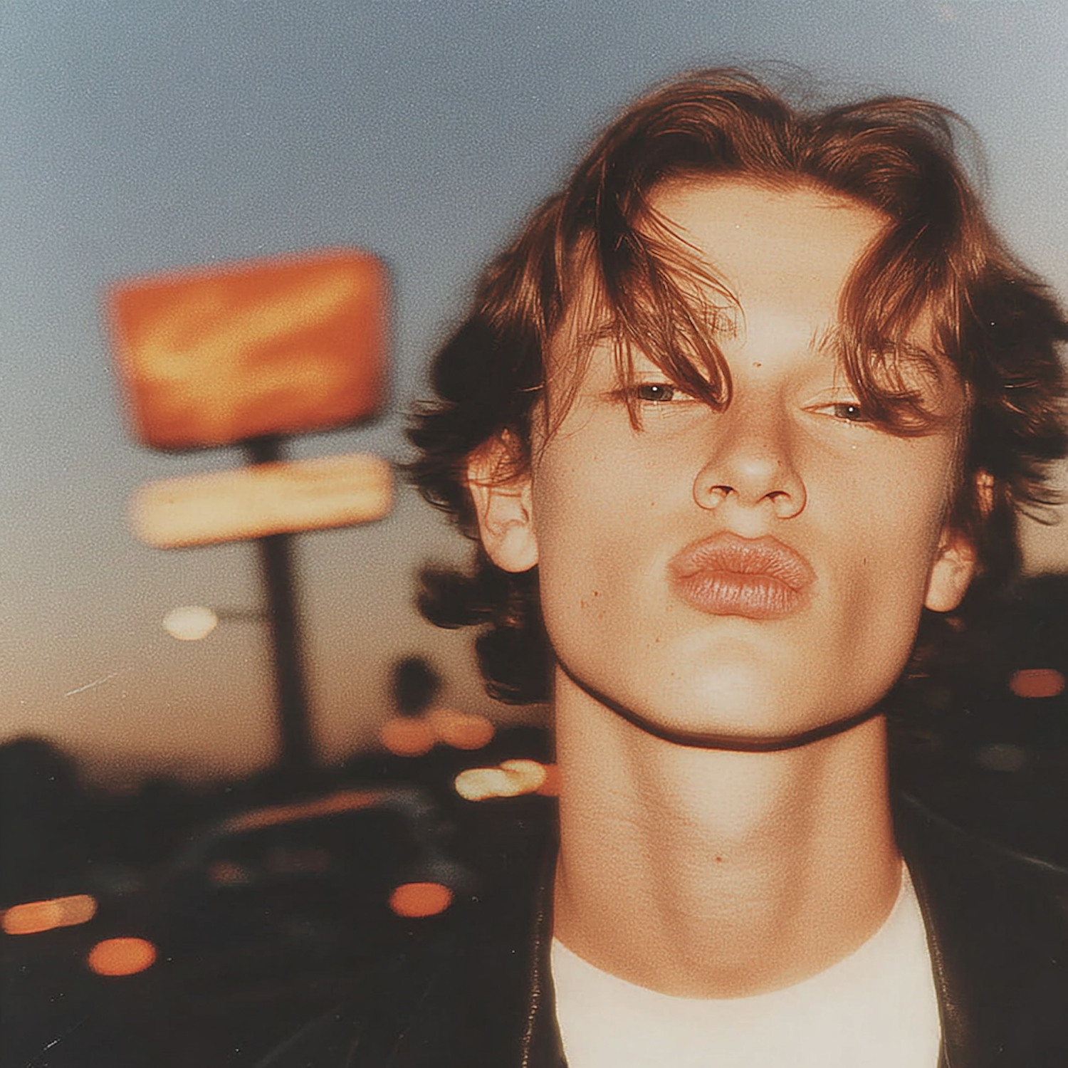 Close-up of a young person with wavy brown hair and a pouty expression, set against a blurred urban sunset background.
