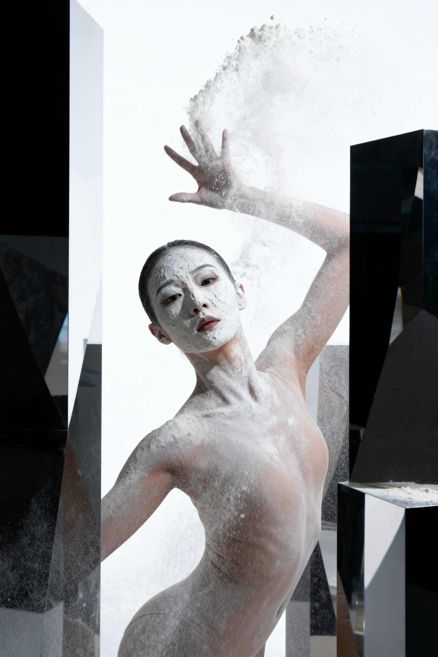 Artistic photo of a powdered individual in a dynamic pose, surrounded by geometric black structures, emphasizing texture and contrast.
