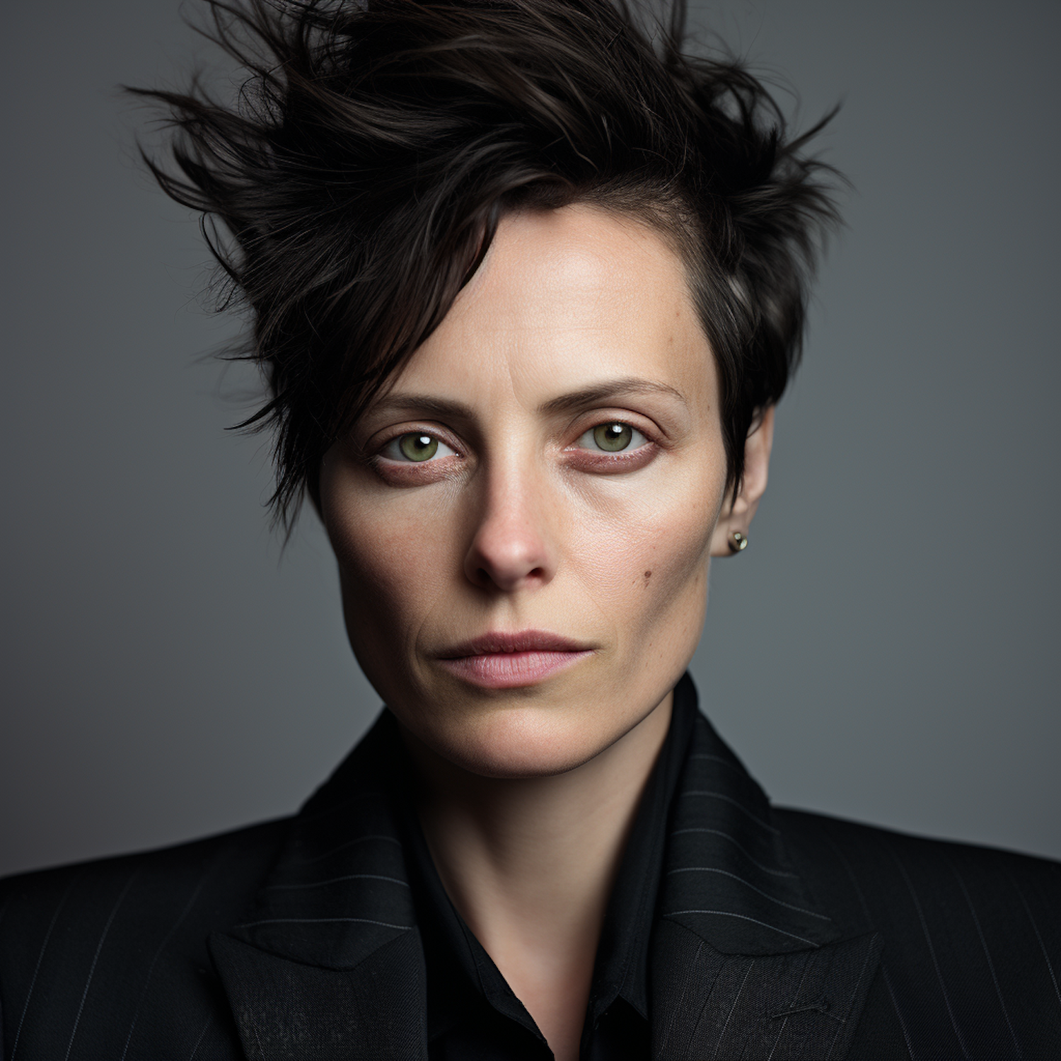Caucasian woman with short dark hair in a black suit, serious expression, green eyes, neutral gray background.