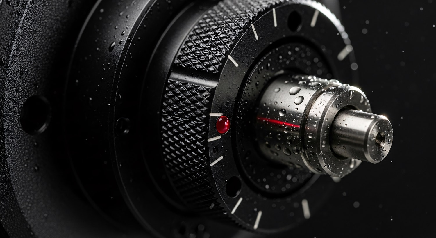 Close-up of a precision-engineered mechanical part with water droplets, showcasing intricate details and a polished metallic finish.