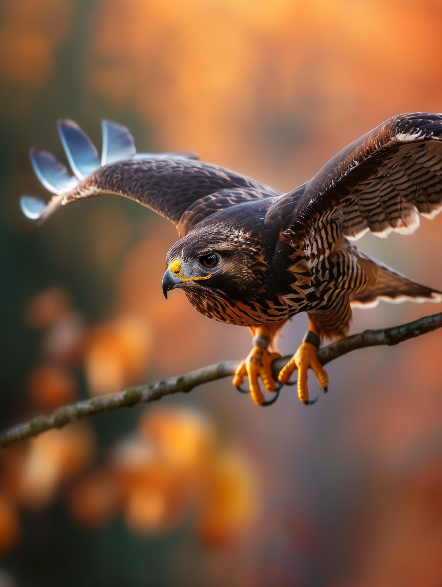 A hawk in mid-flight with wings spread, set against a warm autumn backdrop, showcasing its detailed feathers and sharp talons.
