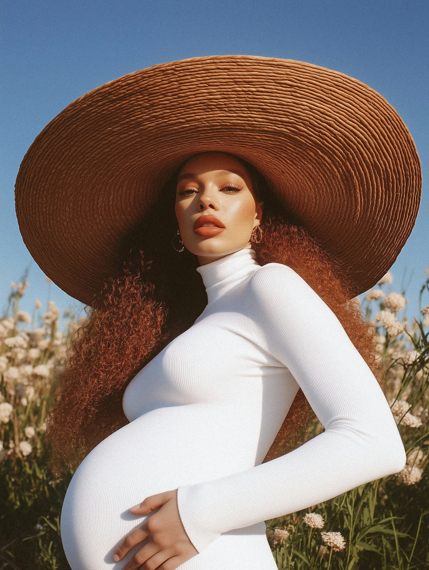 Pregnant woman in a white dress with a large straw hat, standing in a flower field under a clear blue sky.