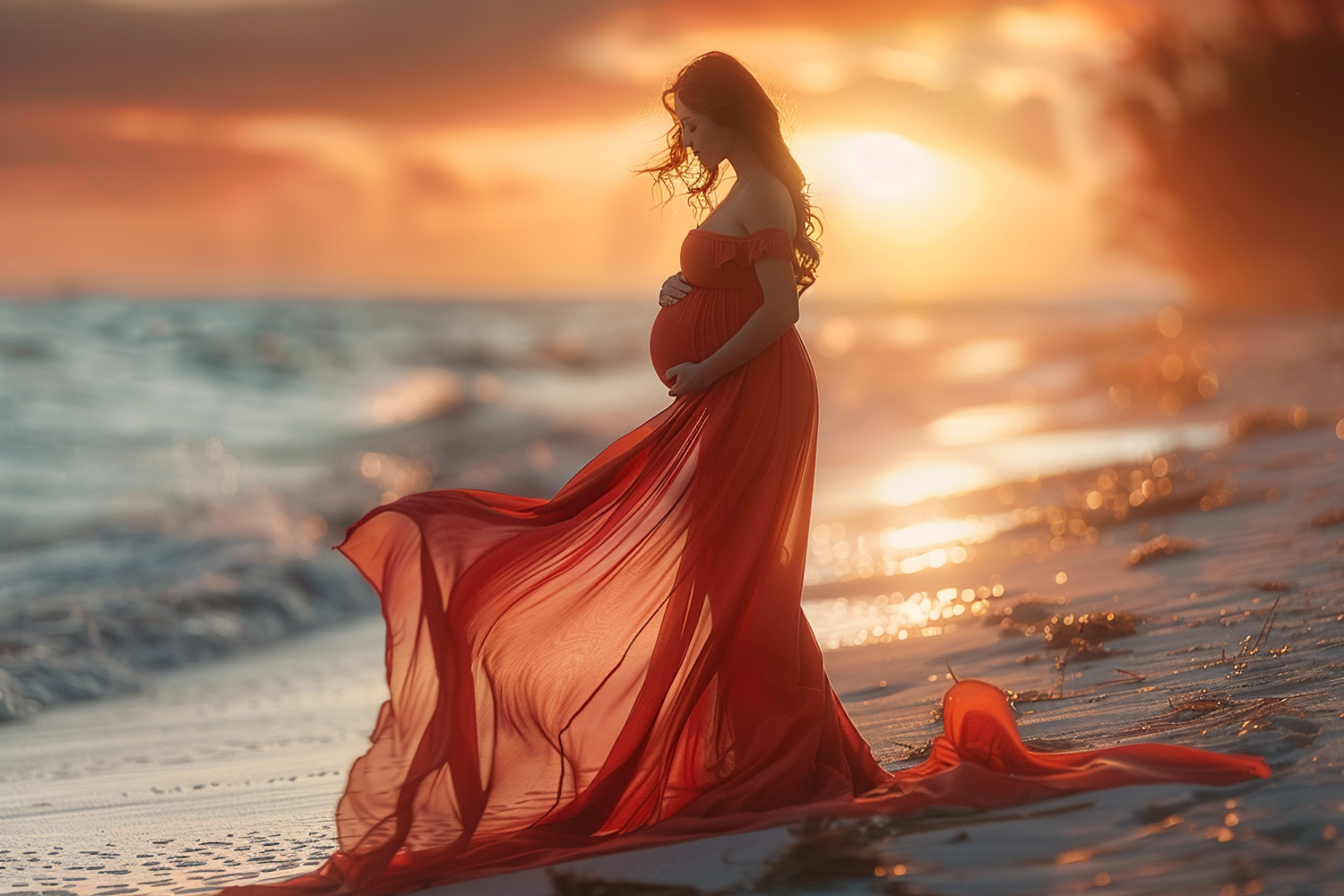 Pregnant woman in a flowing red dress on a beach at sunset, with vibrant orange and pink sky reflecting on the ocean waves.