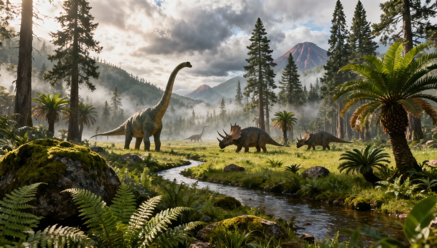 Dinosaurs roam a lush prehistoric forest with a stream, ferns, and volcanic mountains in the background, creating a vivid ancient scene.