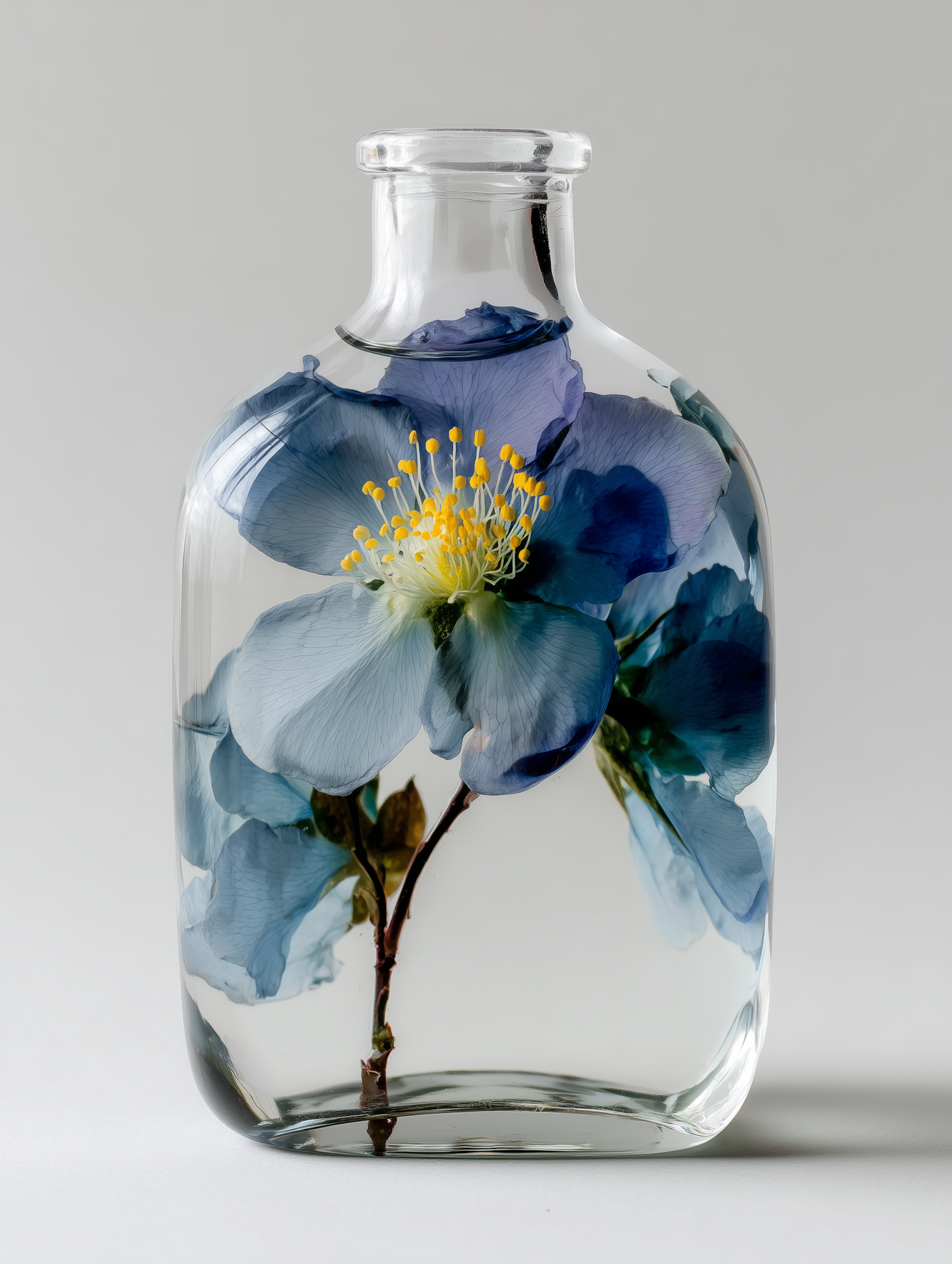 A clear glass bottle with a preserved blue flower and yellow stamens inside, set against a neutral gray background.