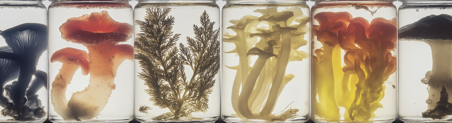 A row of jars with preserved fungi and plants, showcasing vibrant colors and intricate textures in a clear liquid.