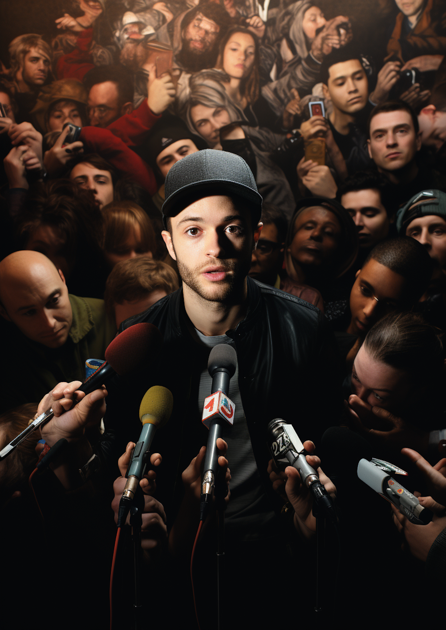 A young man in a cap faces a crowd with microphones, capturing a moment of intense media attention.