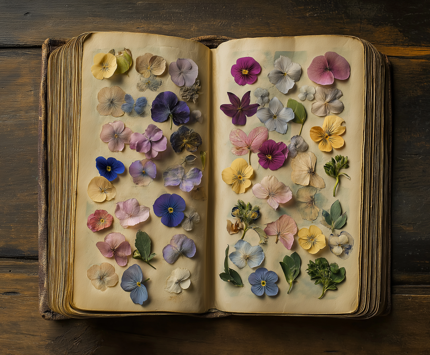 Open book with pressed flowers in various colors on aged pages, set on a wooden surface.