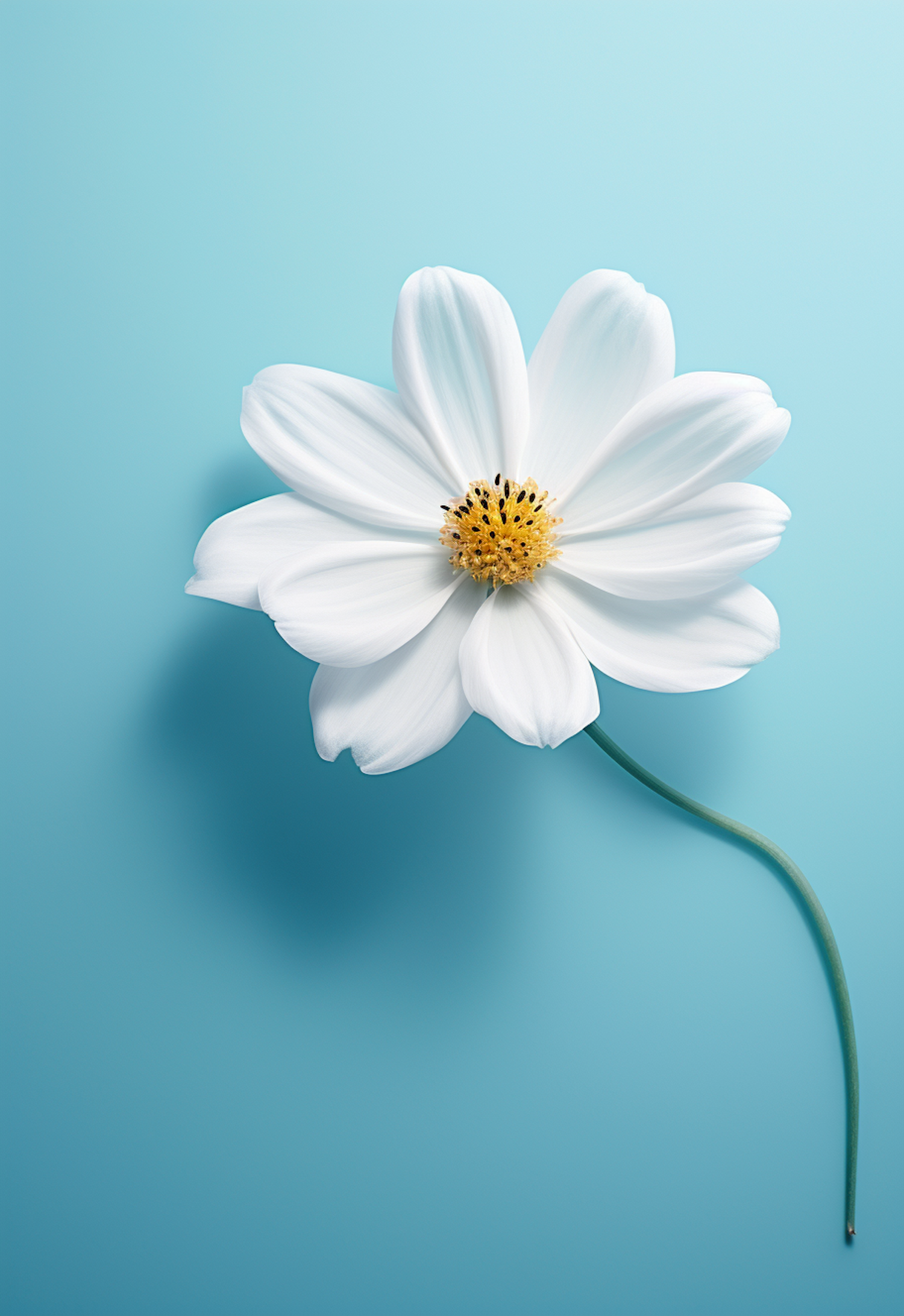 Elegant white flower with yellow center on a light blue background, showcasing simplicity and beauty in a minimalist style.