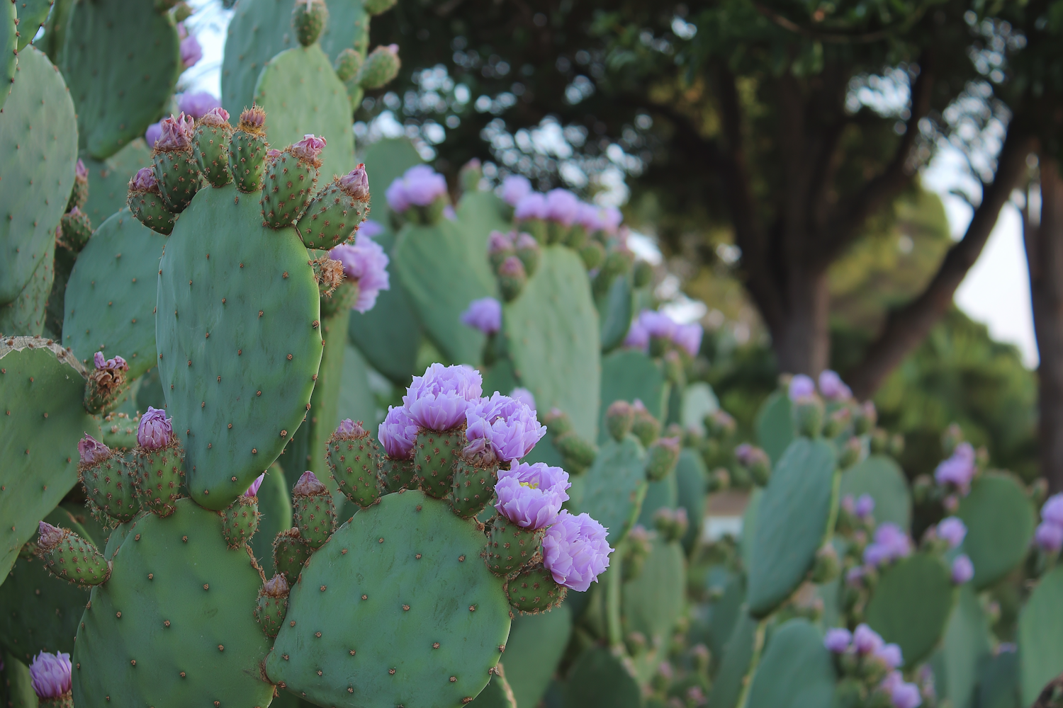 Close-up of purple flowering cactus, set against a softly blurred garden background.