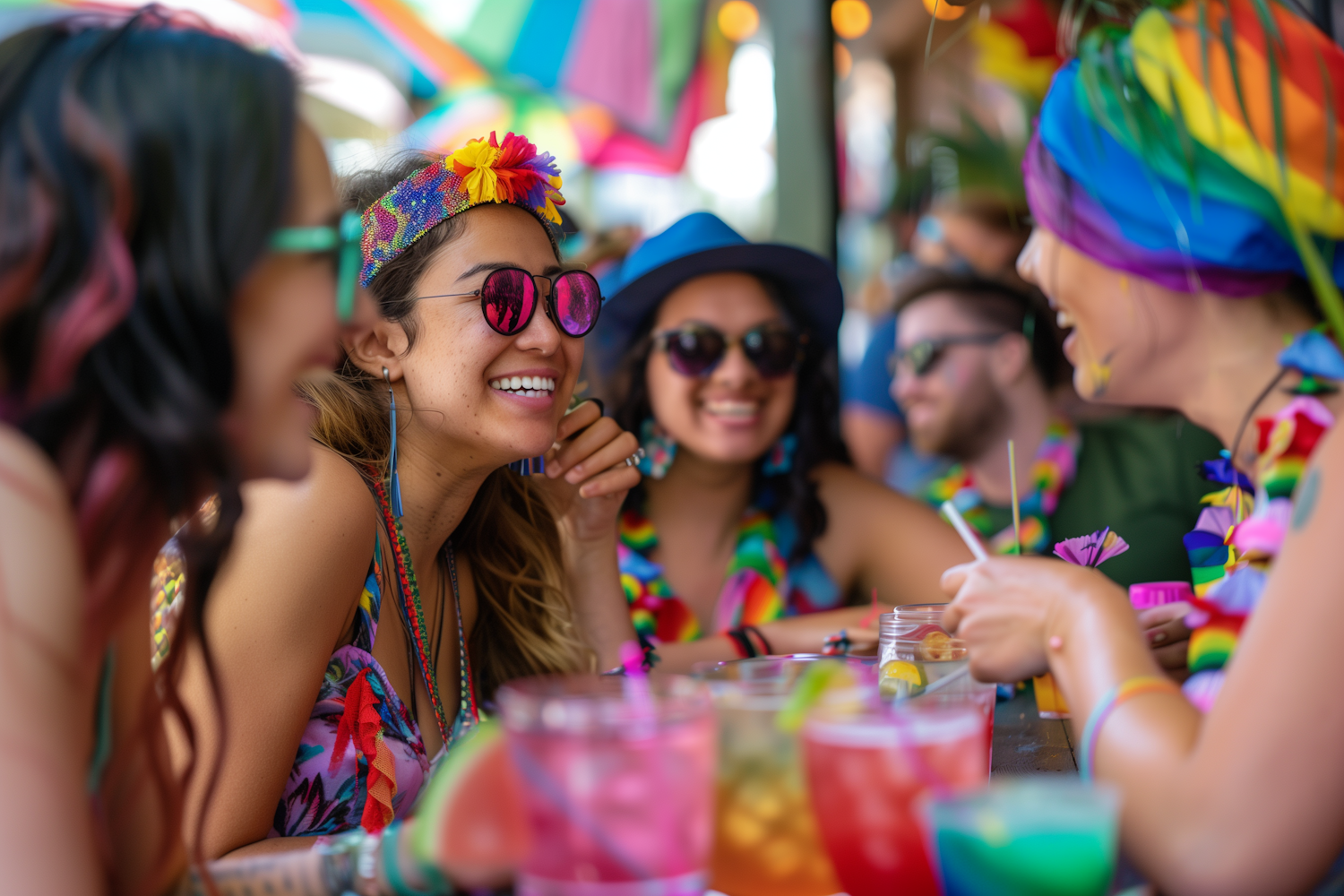 A lively group enjoying colorful drinks at an outdoor gathering, dressed in vibrant rainbow-themed attire under multicolored umbrellas.