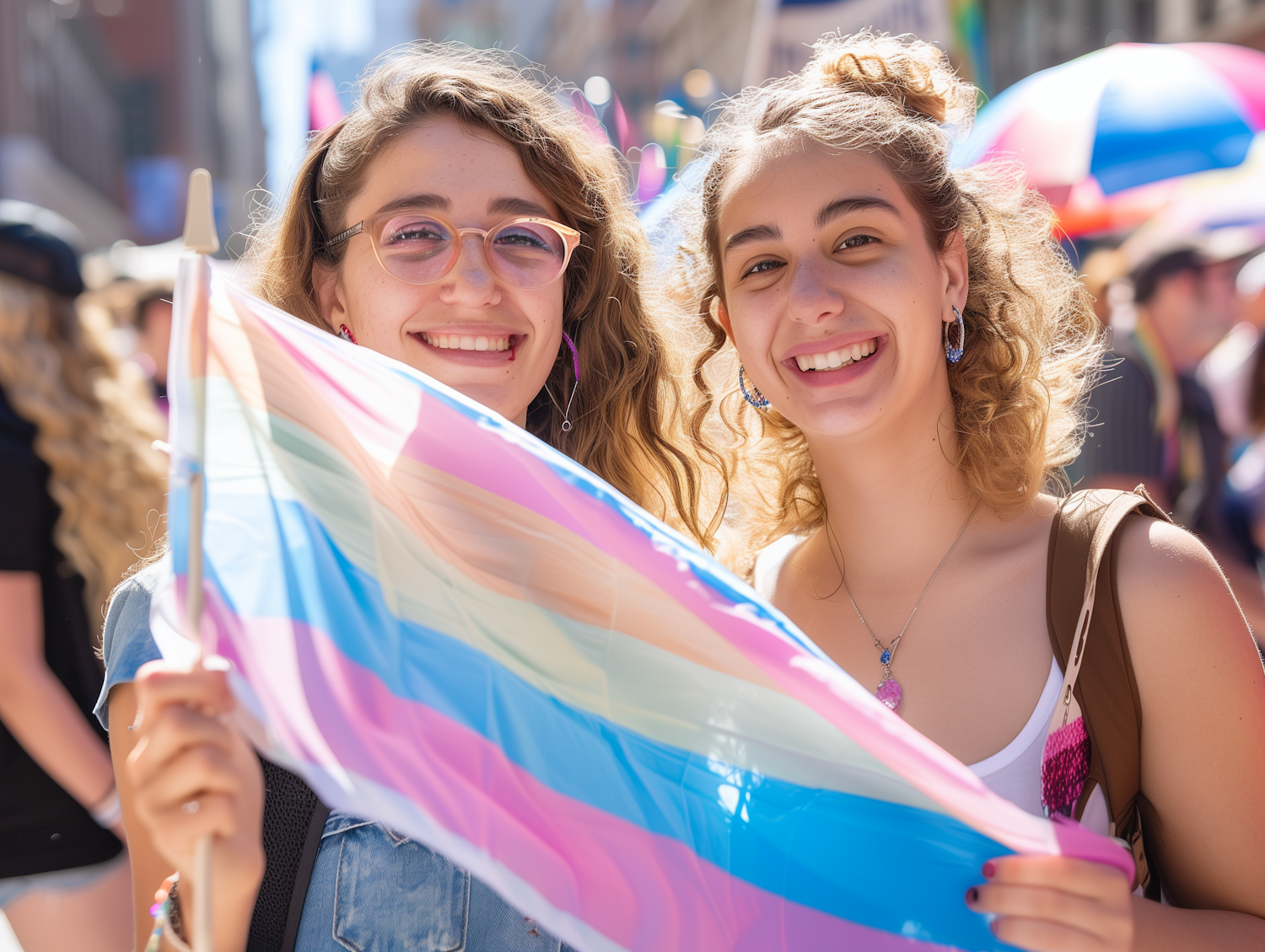 Two young women smiling and holding a colorful pride flag at a lively outdoor event.