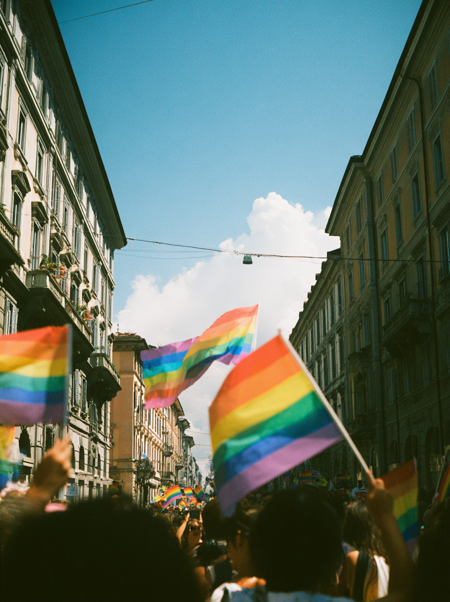 A vibrant street filled with individuals holding rainbow flags, showcasing unity and celebration against a bright and serene sky.