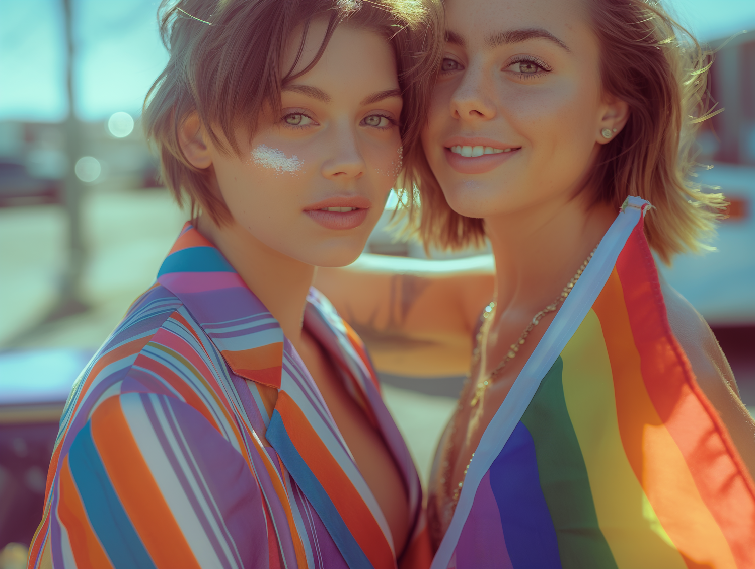 Two women celebrate with a rainbow flag, exuding joy and pride in vibrant, colorful attire under bright sunlight.