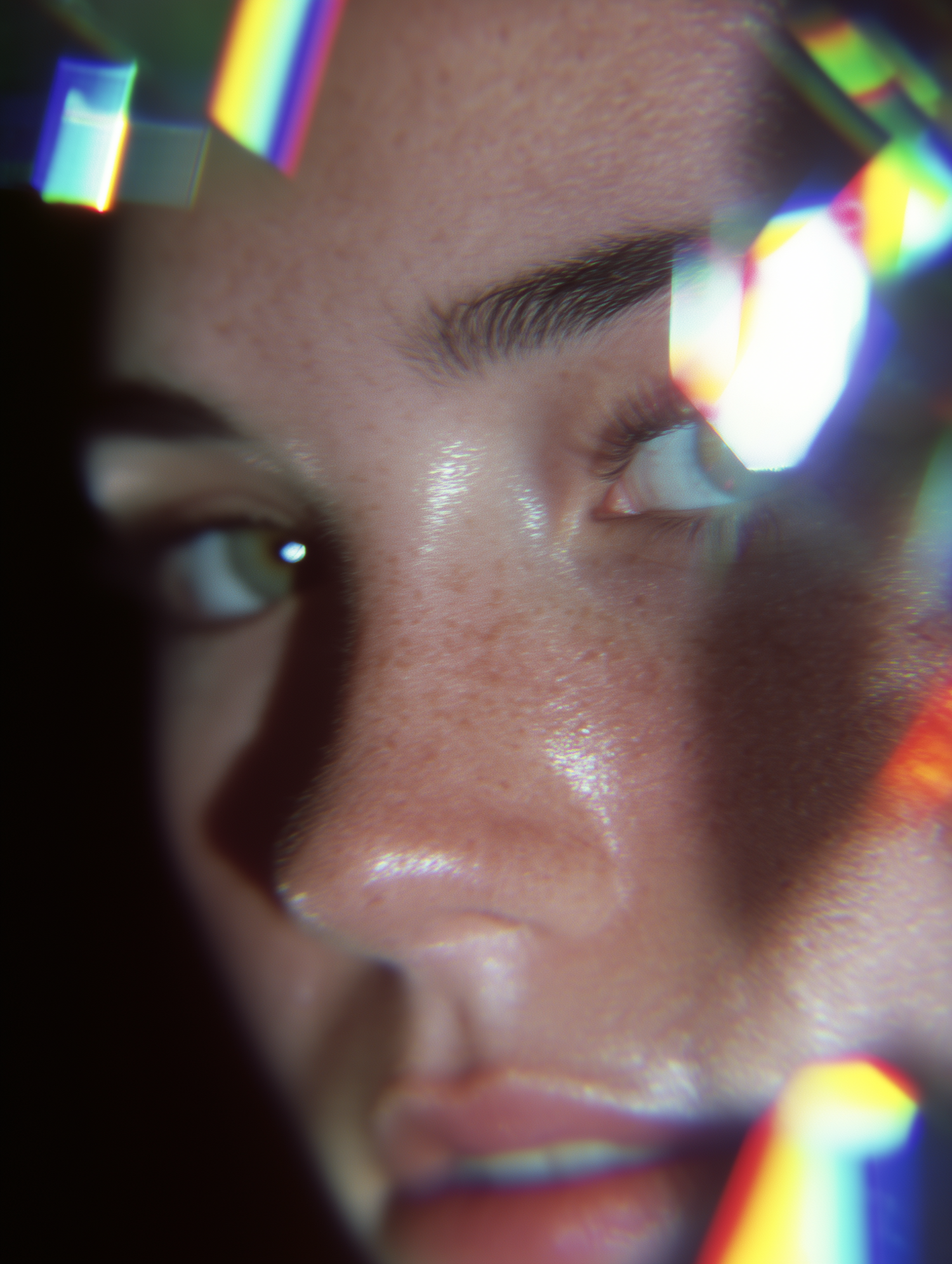 Close-up of a freckled face with prism light effects, highlighting green eyes, smooth skin, and a dreamy, abstract aesthetic.