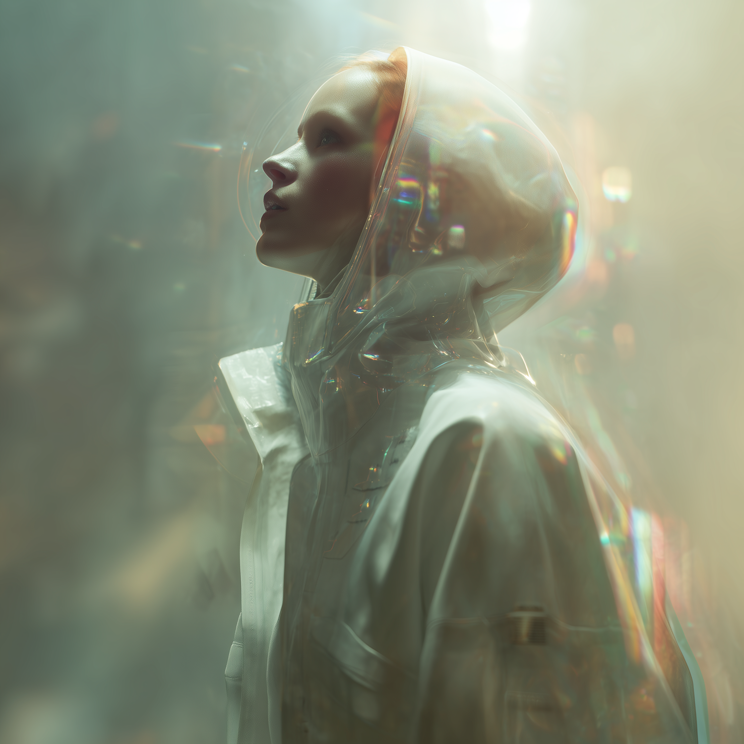 A futuristic portrait of a person in a translucent hooded outfit, with prismatic light effects creating an ethereal atmosphere.
