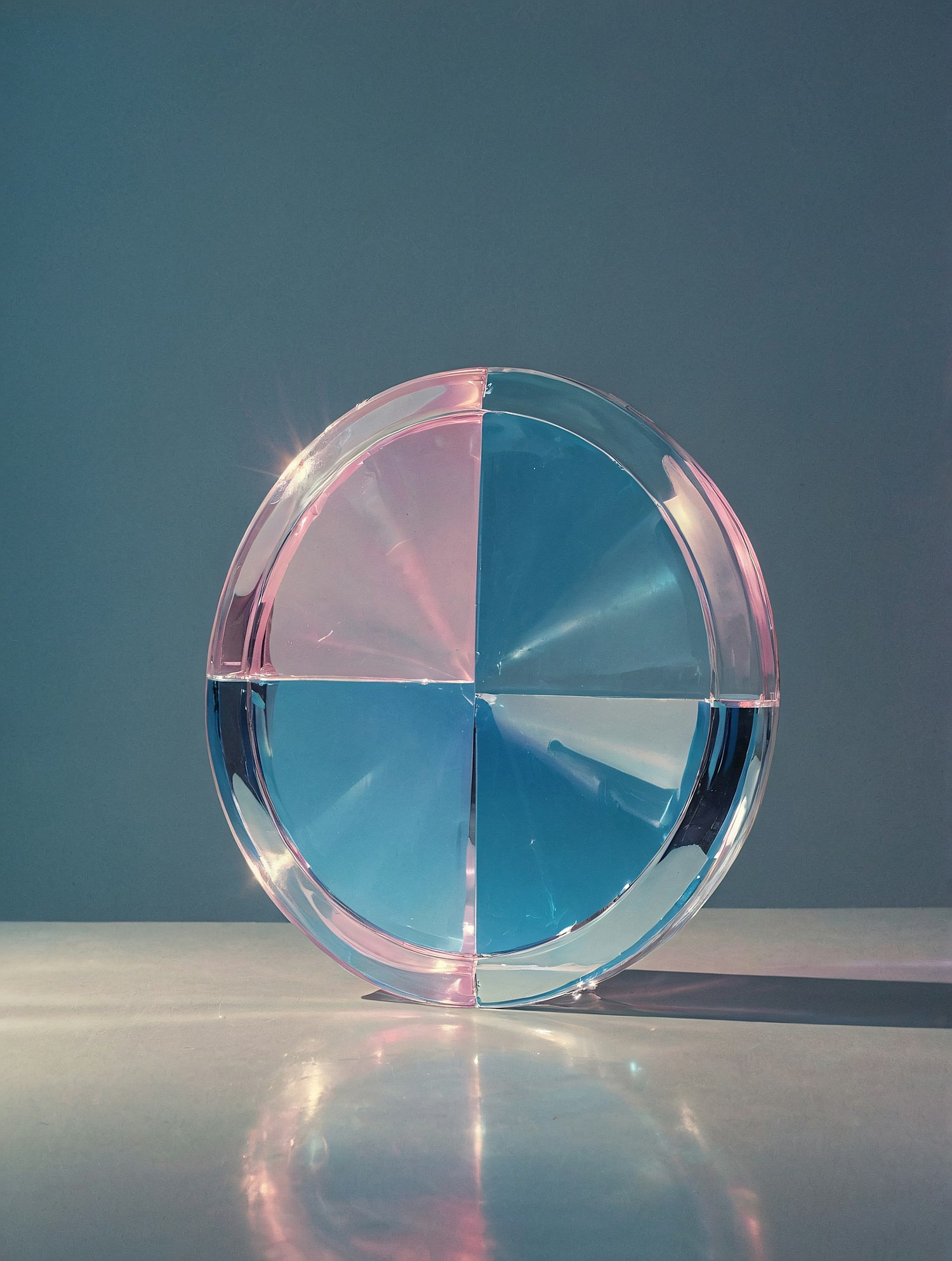 A circular glass object with pink and blue quadrants refracts light beautifully, casting soft patterns on a smooth surface.
