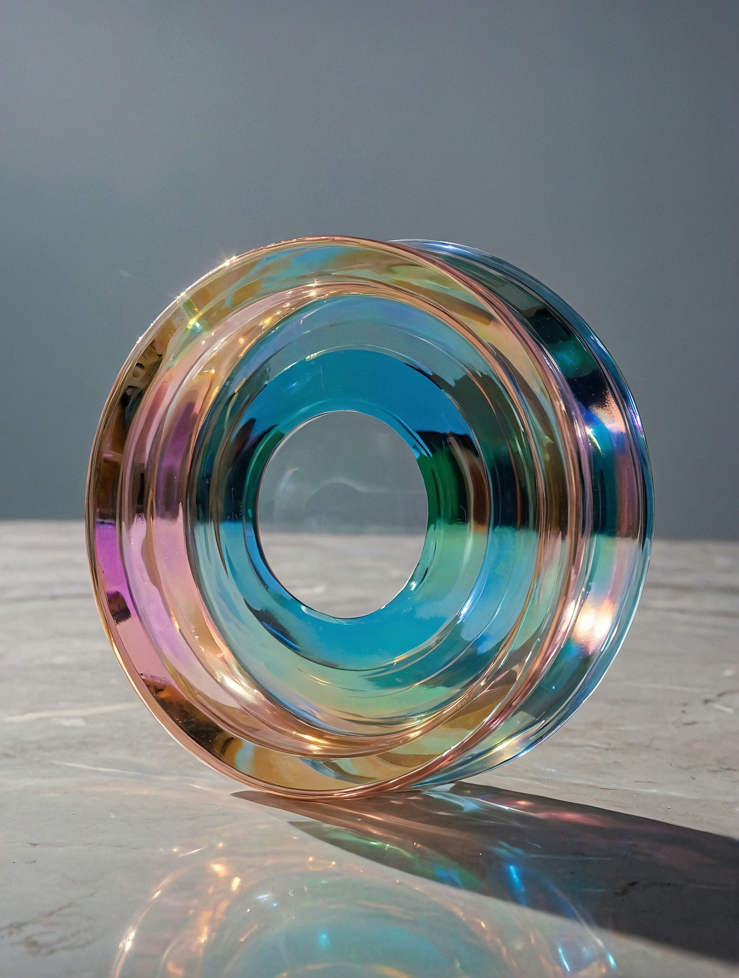 A colorful, iridescent circular object with a hollow center reflecting light on a marble surface, creating vibrant hues and reflections.