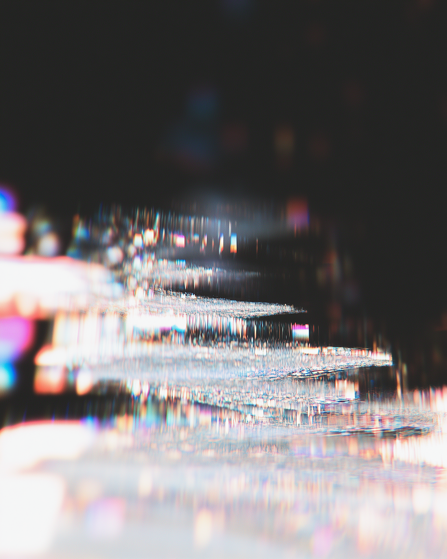 Abstract light refraction with shimmering textures and prismatic colors on a dark background, creating a dreamy, ethereal effect.